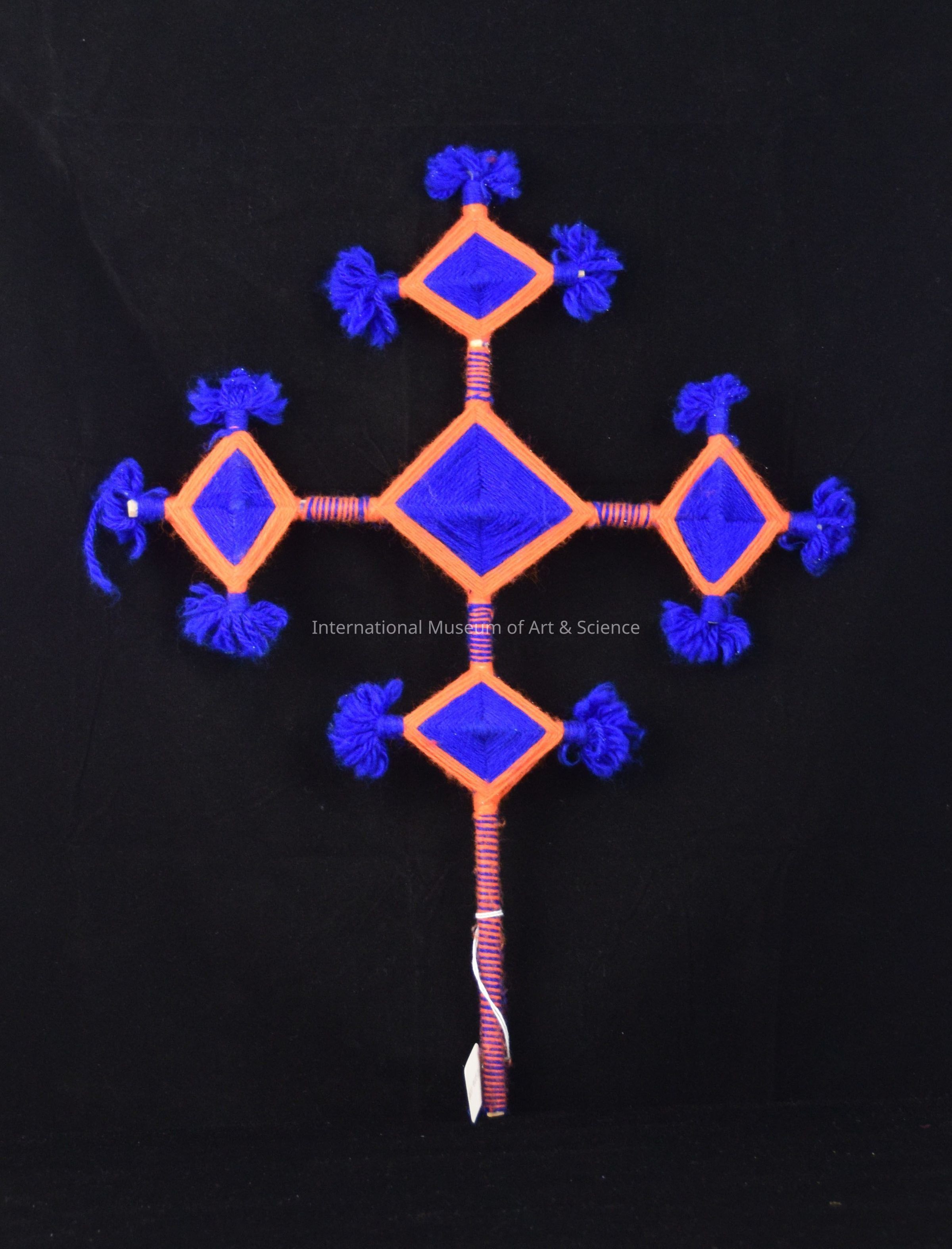 An "Ojo de Dios" or God's eye ornament. This ornament is woven with blue and ornage yarn. It has a center dismond and for surrounding diamonds with tasseled ends.