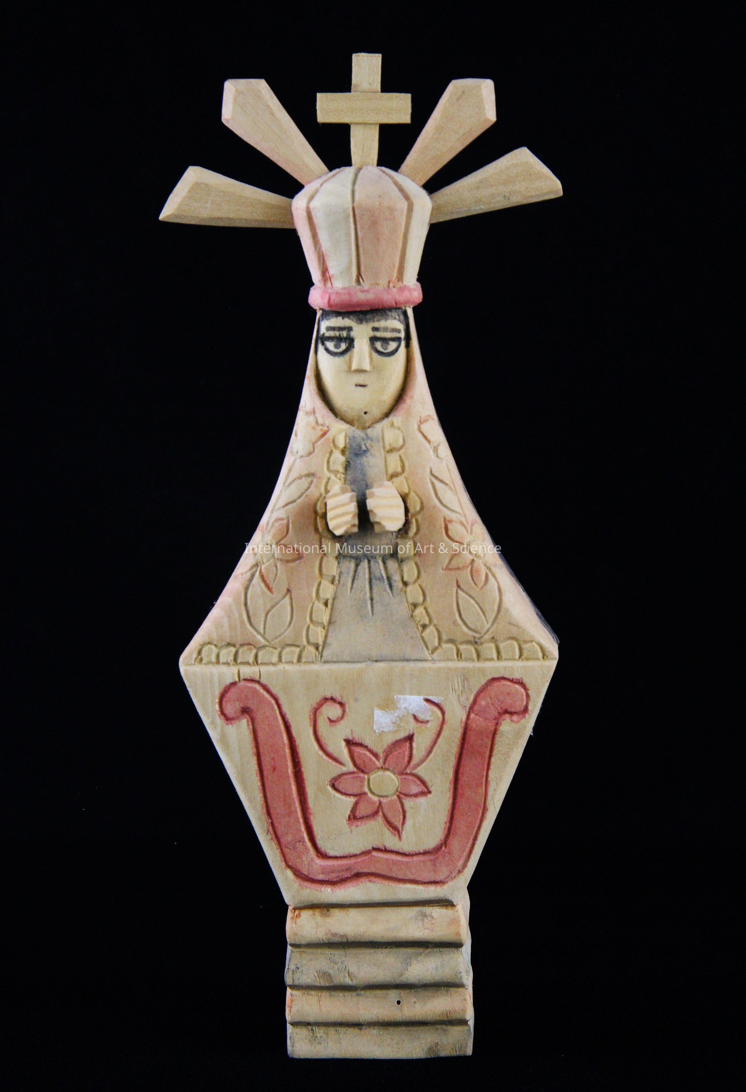 A hand carved figurine of Our Lady of Solitude. The piece had pink accents and an ornate carved crown. She carrys a wooden flower that is detachable.Made/Created