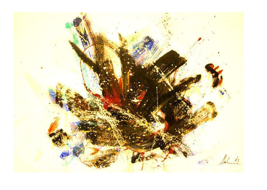 "Outburst" by Carl Mohner. Black, blue, red, white, green abstract on white background.Dimensions