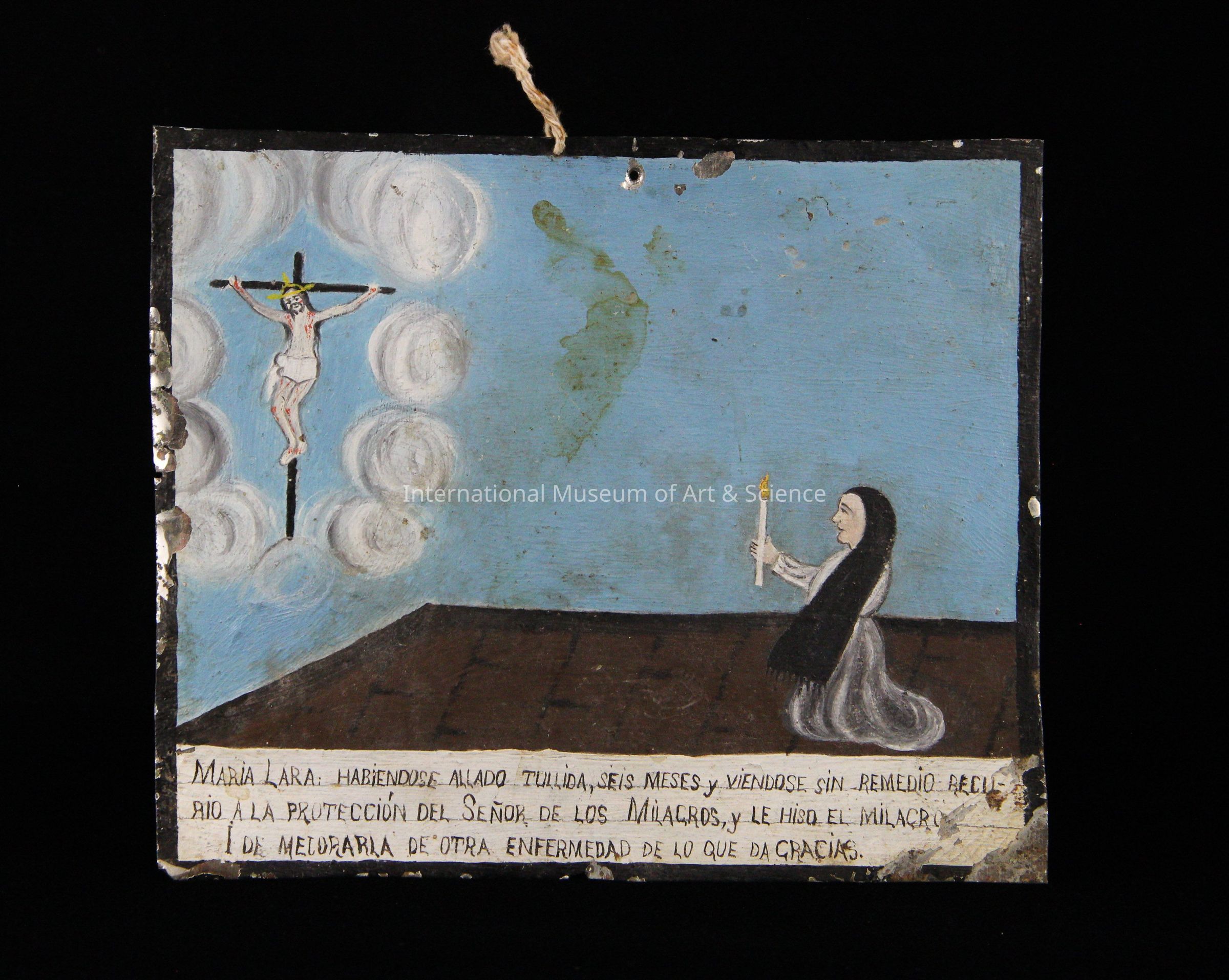 A painting done of a sheet of tin. The painting shows a woman praying to "el senor de los milagros".