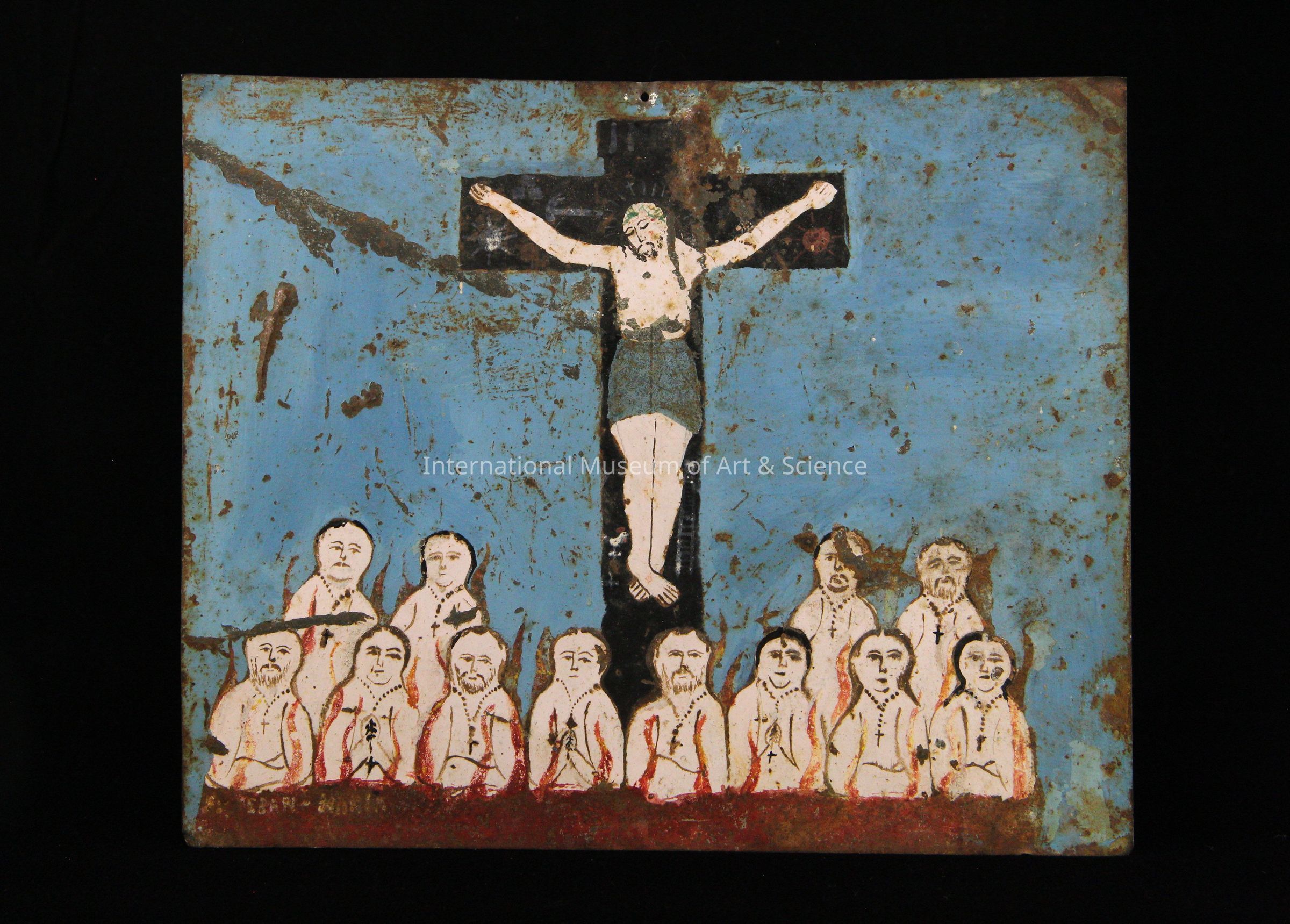 A painting on tin. The painting depicts the crucifixion of Christ with souls in purgatory below.