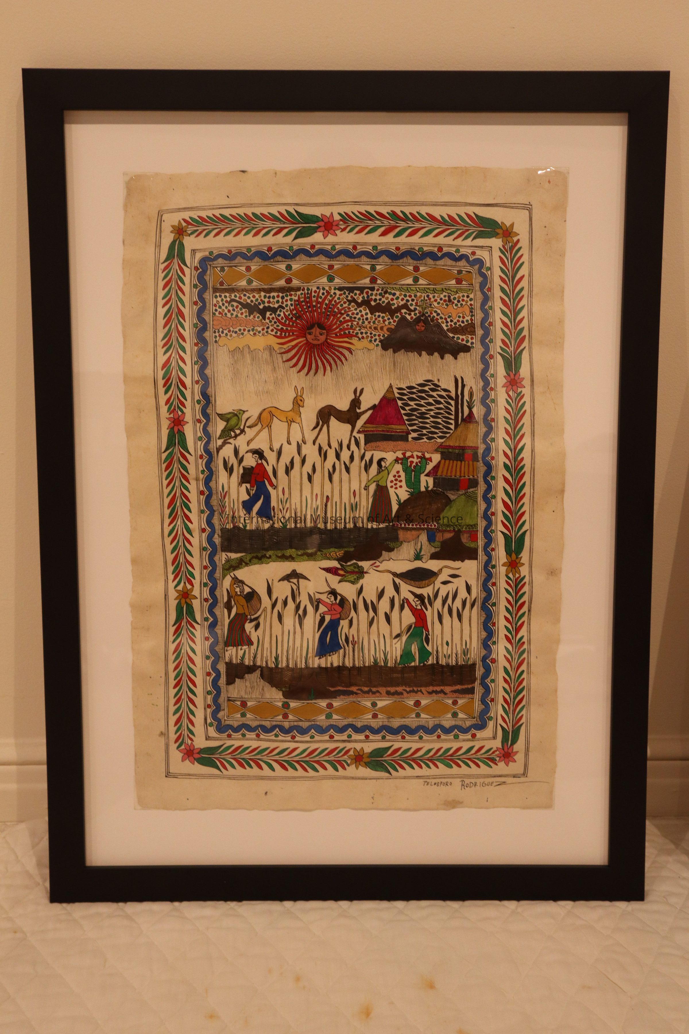 Painting. White amate paper, workers and animals in village and field scene; sun and angel.Made/Created
