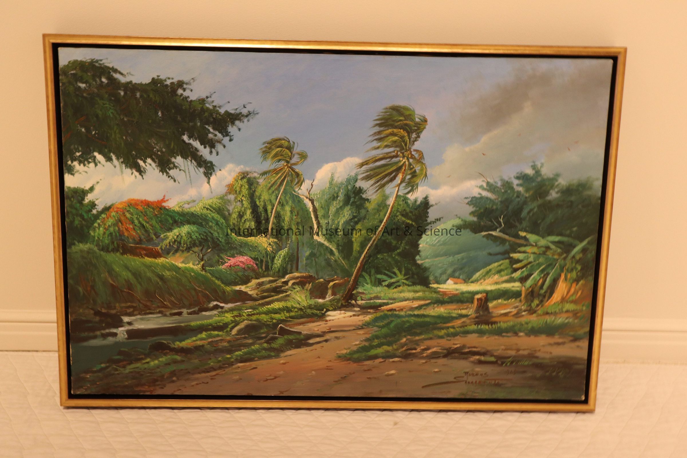 A landscape painting of palm trees blowing in the wind. They are in a topical location, by a river. There is a house in the background with mountains behind.Made/Created