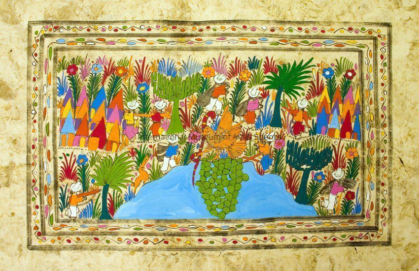 Bark painting. Hunting scene depicting men with rifles, men carrying large black fish nets on their shoulders; men with bushels of hay and carrying dead animals. Multi- colored huts surrounded with colorful tress, bushes and flowers; Lower center of painting has a large orange eagle with a red snake above blue water and greed rocks.Dimensions