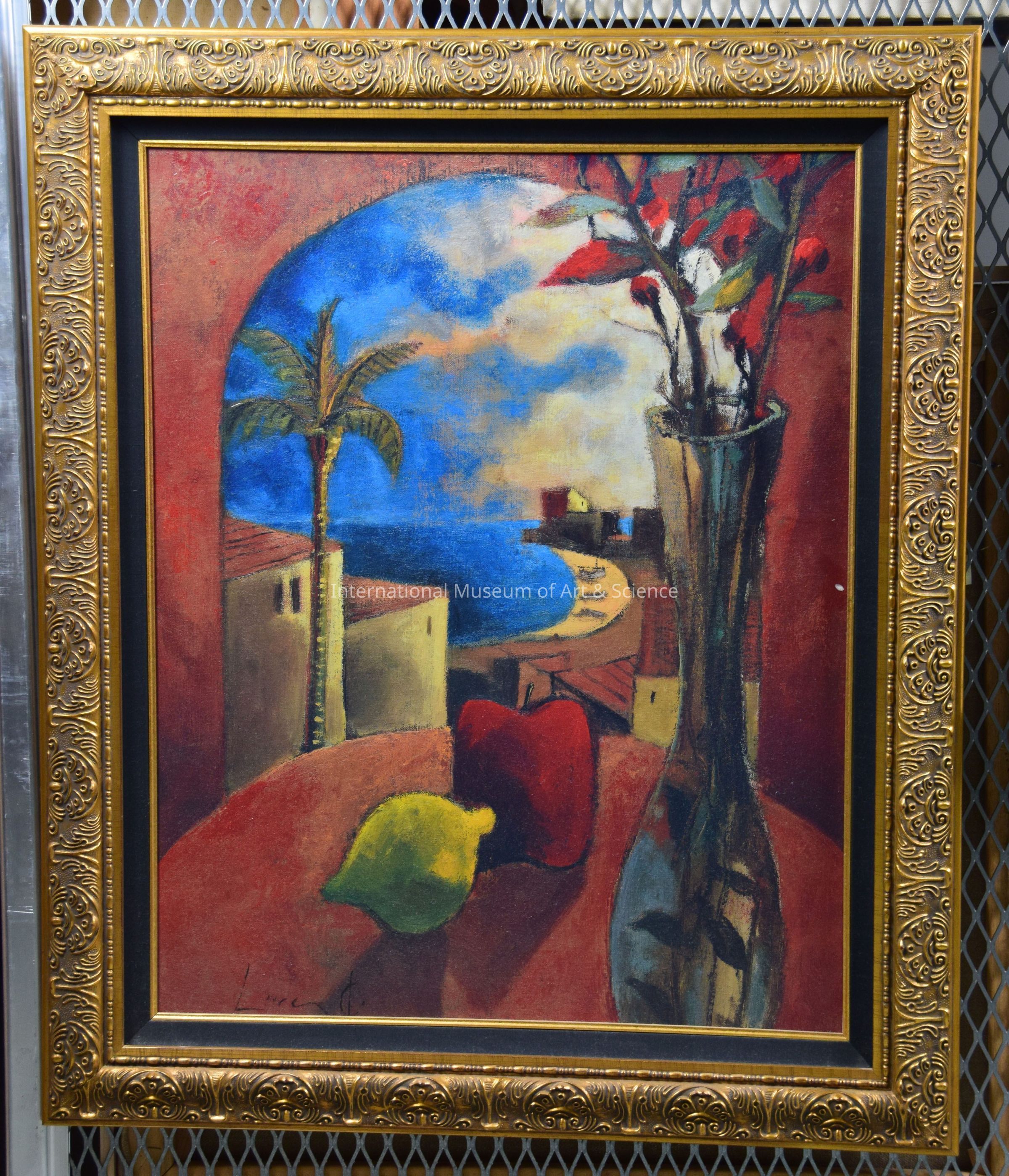 A still-life painting. The piece shows a lemon and an apple with a vase of flowers sitting on a table in front of a window. Out the window one can see a building and palm tree on the left and a beach with a body of water on the right and center. A blue sky with clouds is the background.Dimensions