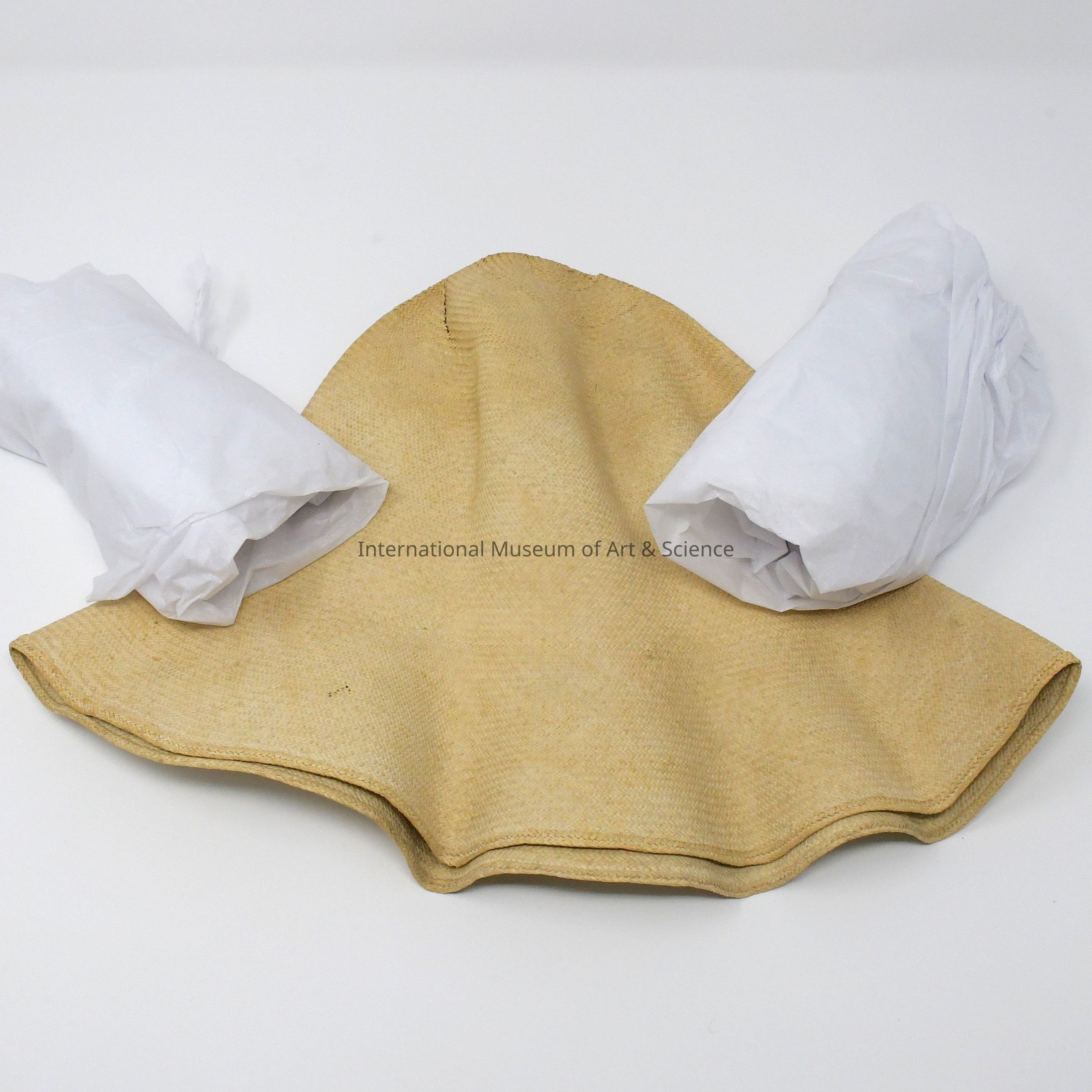 A finely woven, natural straw hat with a wide, undulating brim and rounded crown. The weave is tight and consistent, displaying the smooth texture characteristic of high-quality toquilla straw. The brim exhibits a subtle wave pattern along the edge, likely shaped during production to provide both sun protection and stylistic flair. The natural coloration of the straw is a pale, golden beige, with slight patina and darker discolorations from age and wear. Two creases along the crown indicate the shaping method used in traditional Panama hat blocking.Ethnography