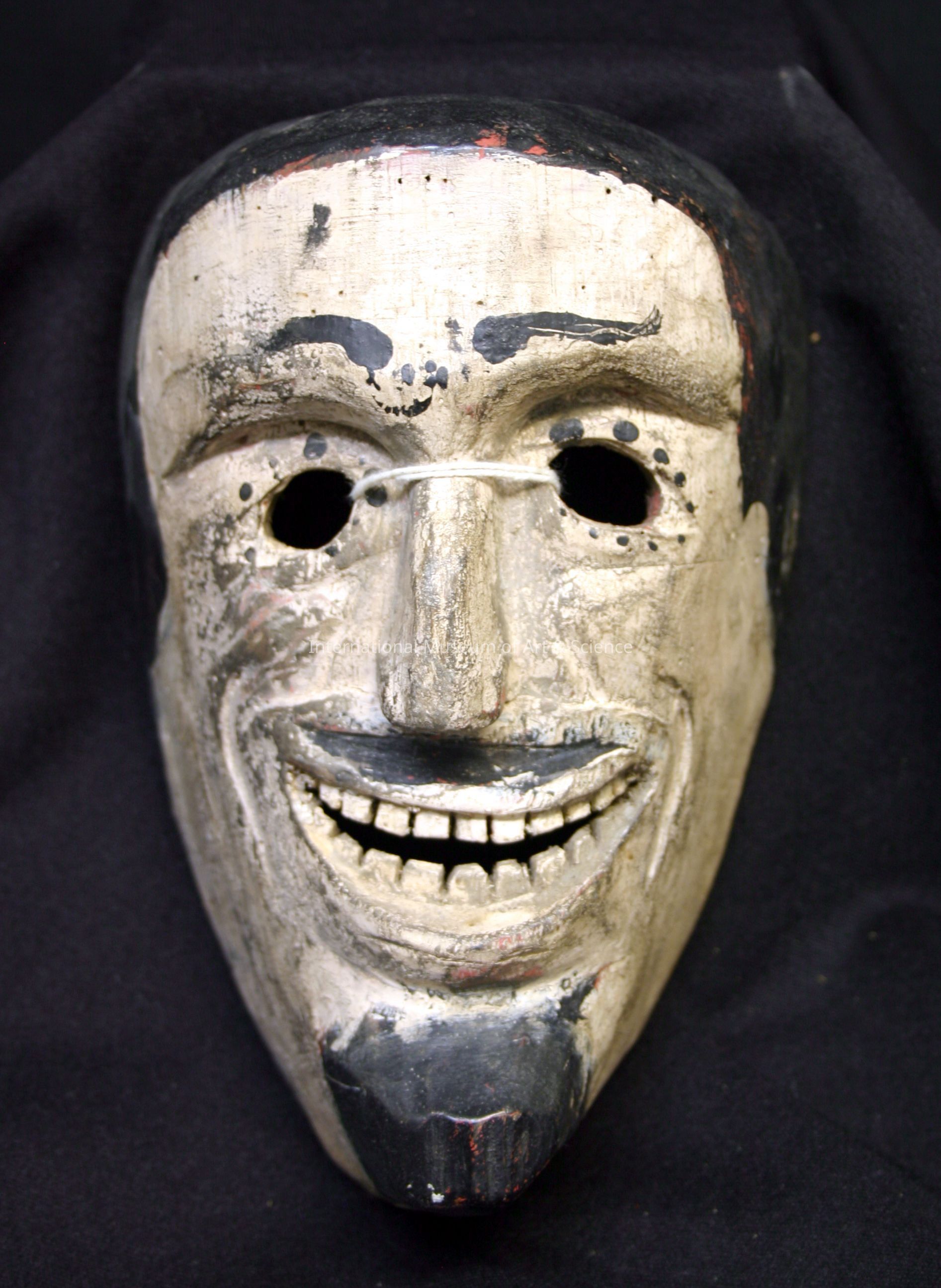 Dance of Juan Negro Mask. Flesh-colored white face with devilish grin; black hair, eyebrows, moustache, and beard; Panol (hacienda owner); carved tooth and circular eyeholes.Dimensions