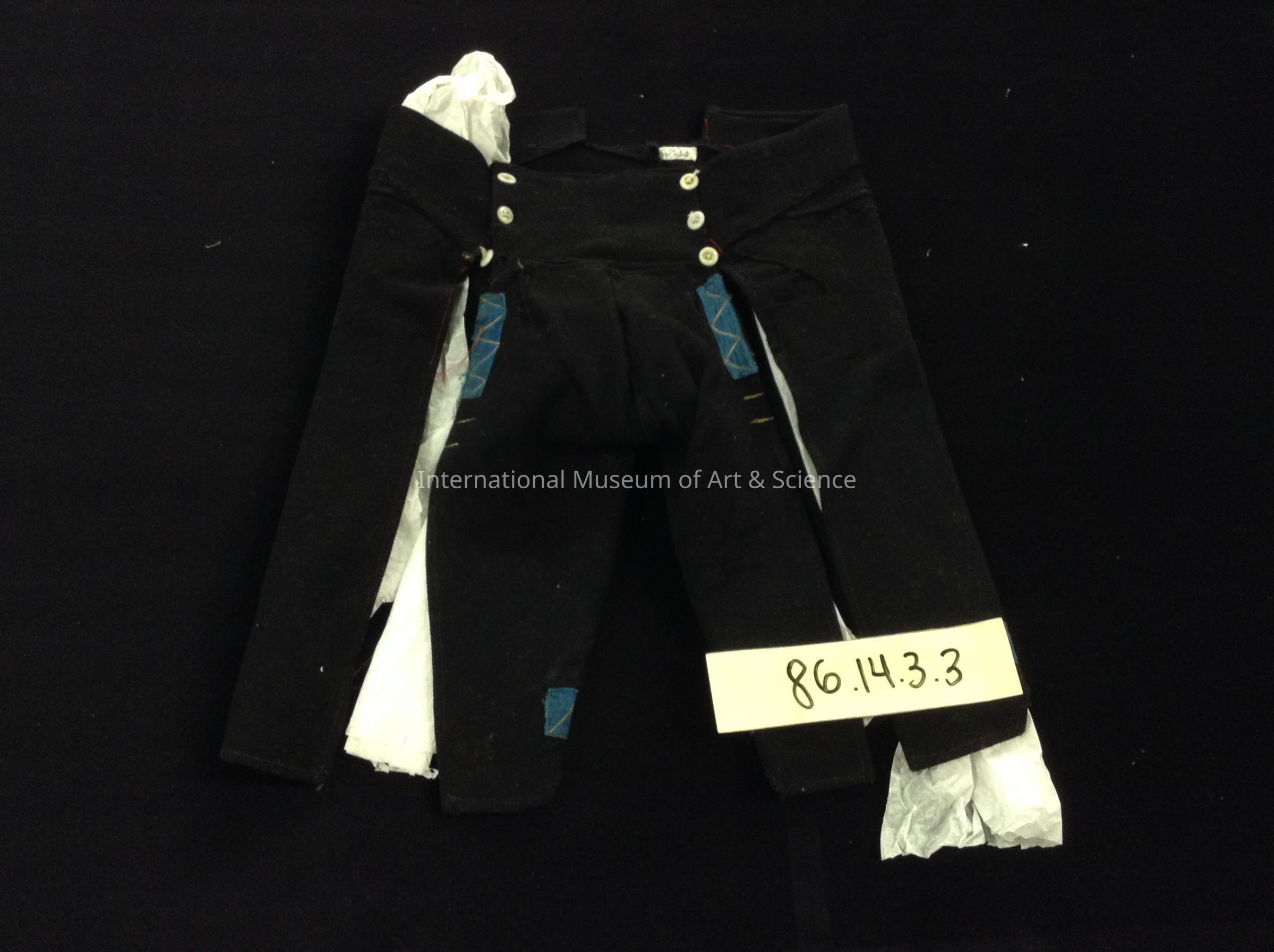 Man's over pants. Black wool over pants; above knee lenghth; six white button on waist; light blue ribbons sewn; leg openings.Artwork Details