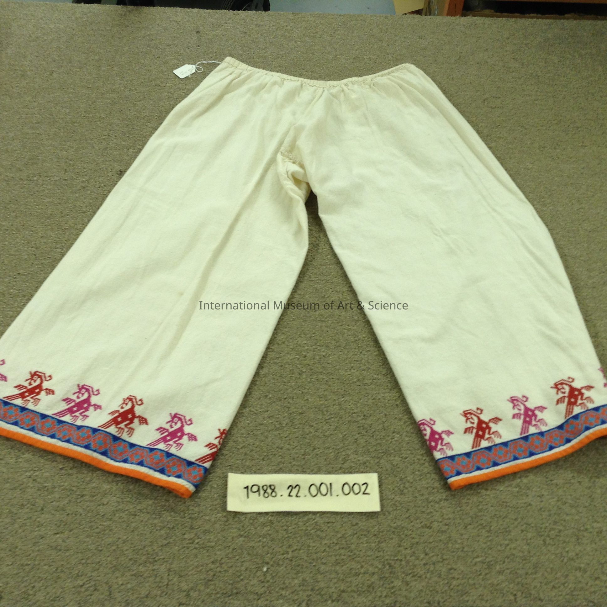 Huichol Indian costume. Man's pants. The pants are elasticized at the waist. The bottom of each pant leg is bordered with a dark blue band wiht lighter blue octagonal structures containing orange geometrical and spherical figures. Above this dark blue band are embroidred red nad mauve roosters. Each pant leg is finished at the bottom with orange cotton material.Artwork Details