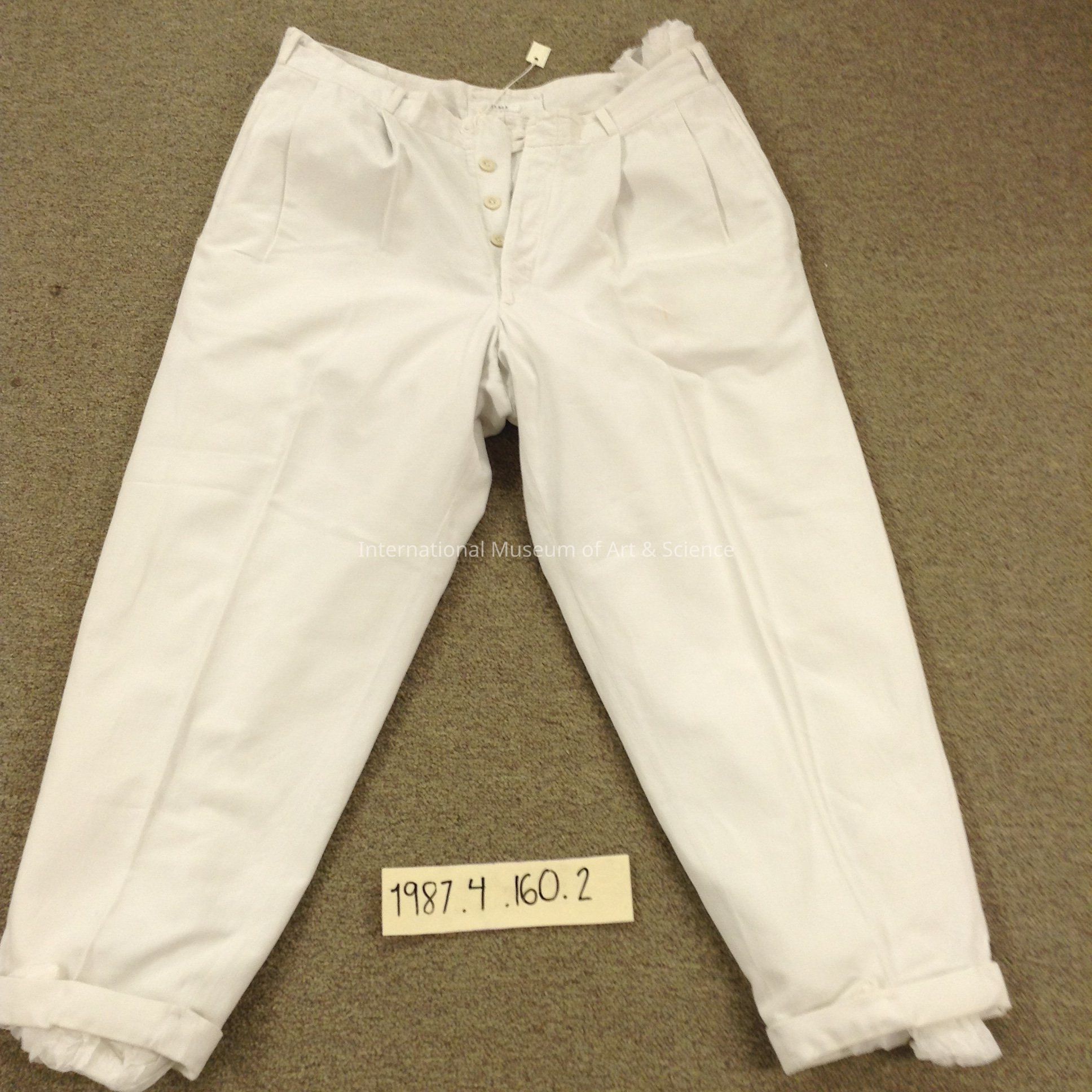A man's wedding suit trousers. The pants are machine stitched from white cotton. They are cuffed, with two pockets in the back, two side pockets, and a button-down fly. They are undecorated except for top-stitching at pockets.Artwork Details