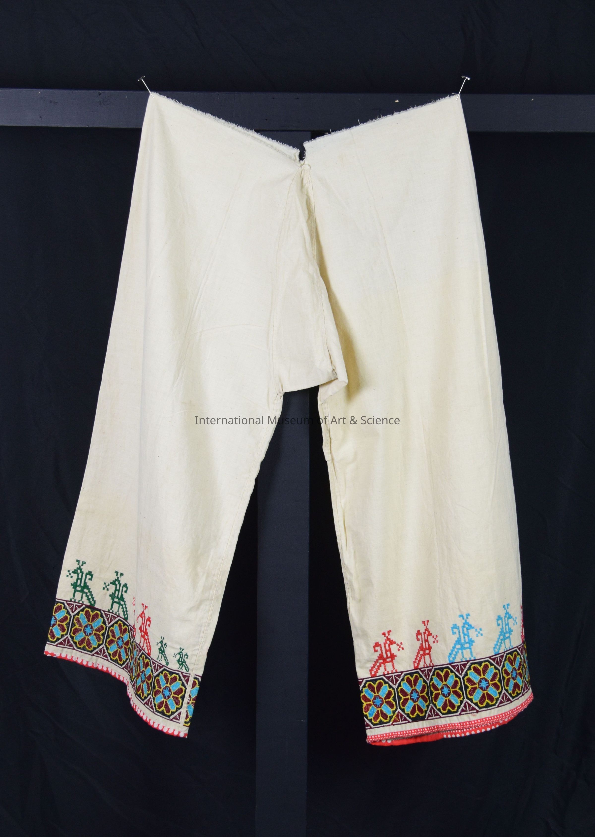 Trousers. Trousers of two wide straight pieces, 32" in circumference, joined by set in crotch; waist edge unfinished; bottom edge in red, white print cotton, band of cross-switching, birds above.Artwork Details