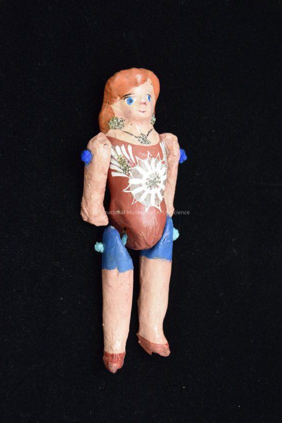 A paper-mache doll with movable arms and legs. The doll is painted and is detailed in glitter.