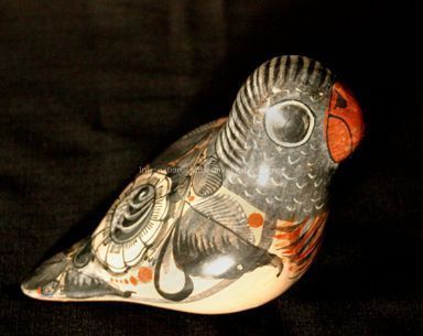 A ceramic figurine of a parrot. The bird has a tan body with red, black, grey, and cream floral details. The bird has a grey head with large black pupils, an orange beak, and a multi-colored breast.Dimensions
