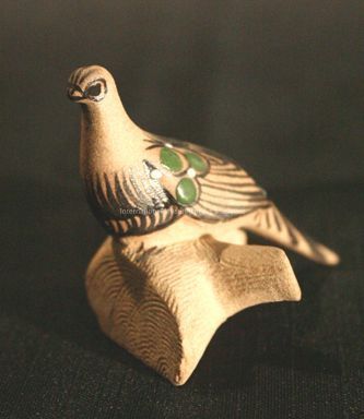 Stoneware Partridge on a log; painted black feathers with green and white accents.