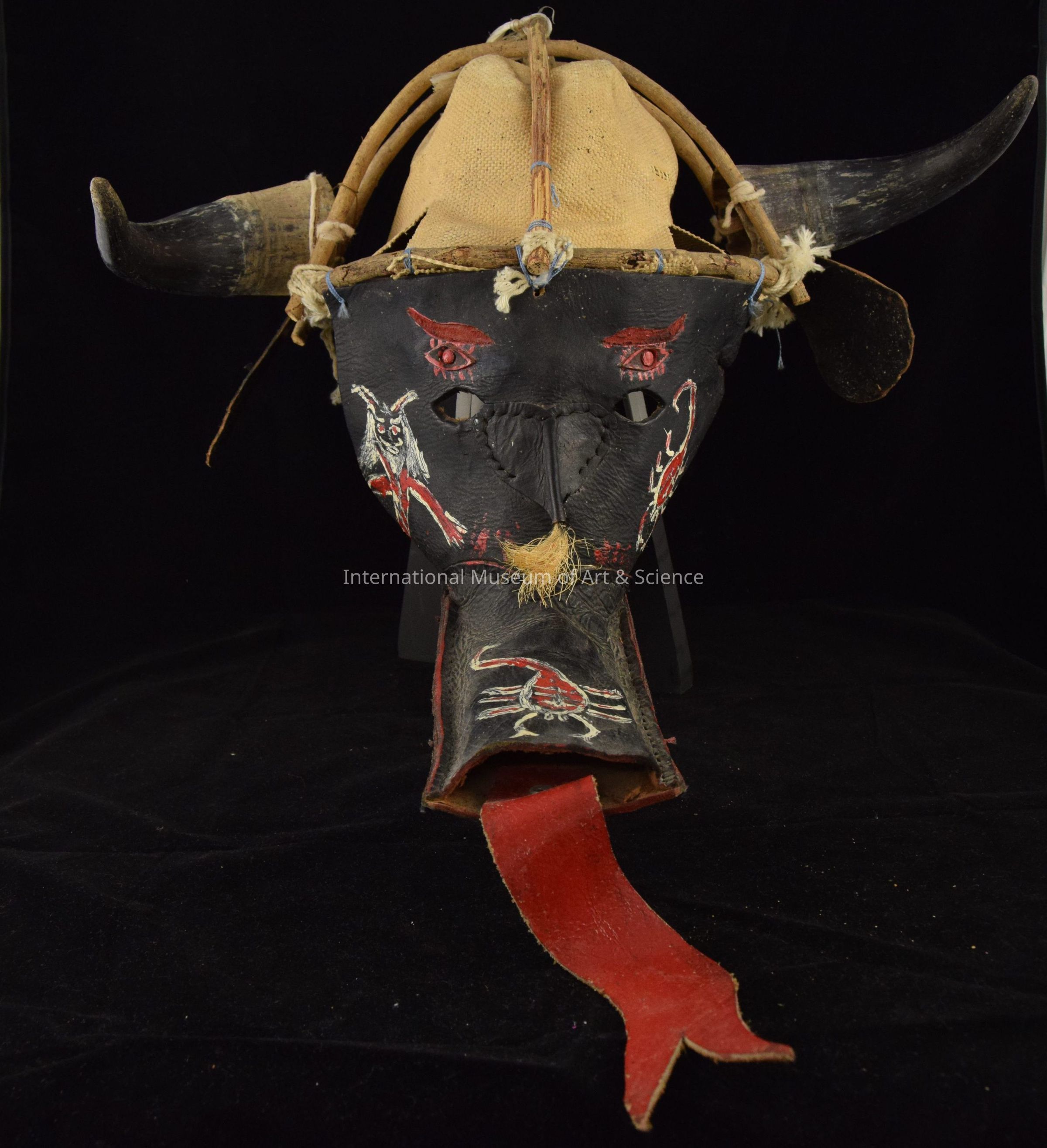 "Pastorela mask". Incomplete pastorela masks for boys; black leather face with long rectangular spout; long red leather tongue attached inside spout; two black cow horns attached above the leather ears; branch crown over plant fiber hat crown; face decorated with red and white scorpions, devil, and red painted eyes; white plastic and cotton cord used for attacching parts; small fibers projected from nose.Artwork Details