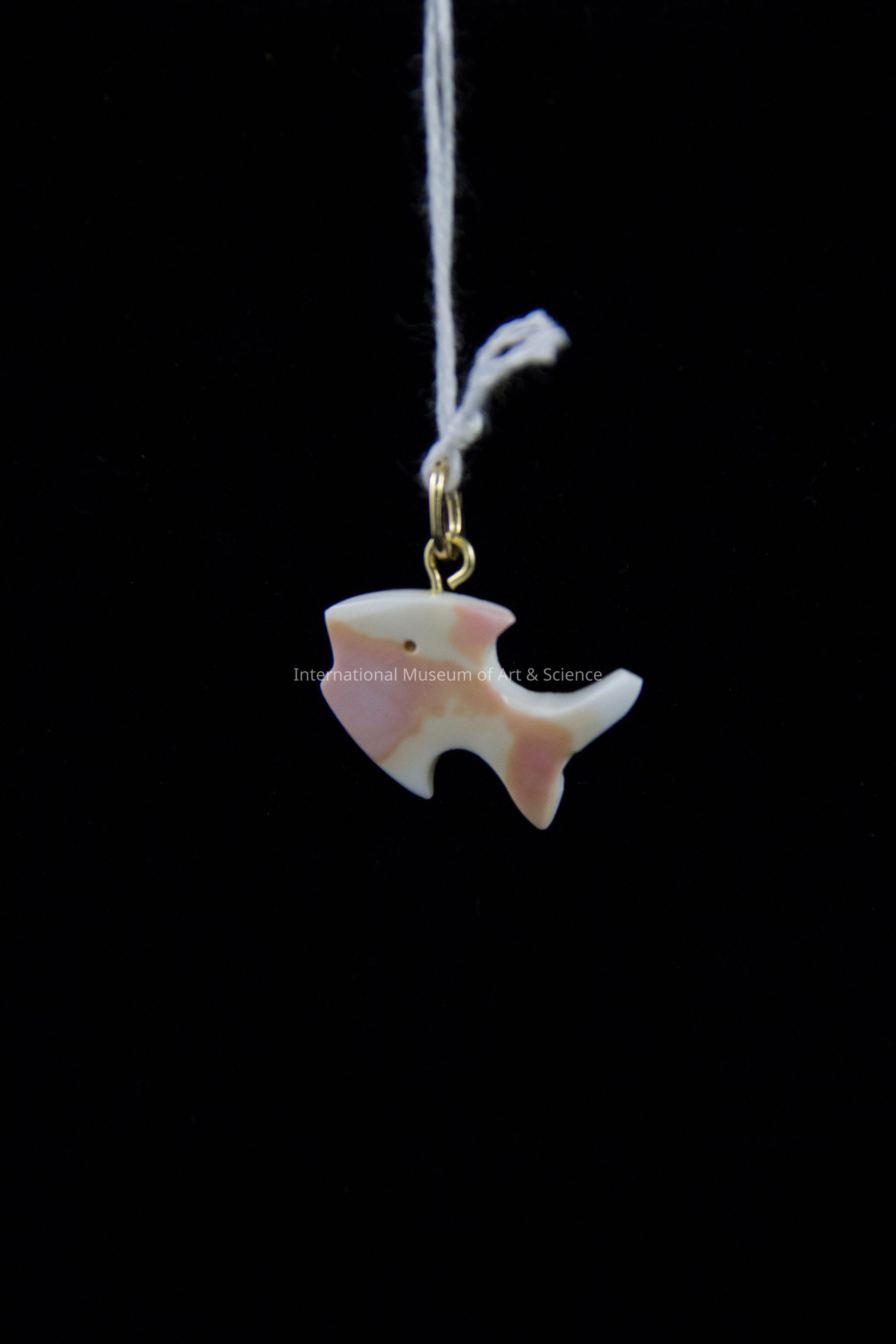 A jewelry pendant. The pendant is made of natural shell. The pendant is carved into a fish. There is a metal ring at the top so it can been attached to a chain.Artwork Details