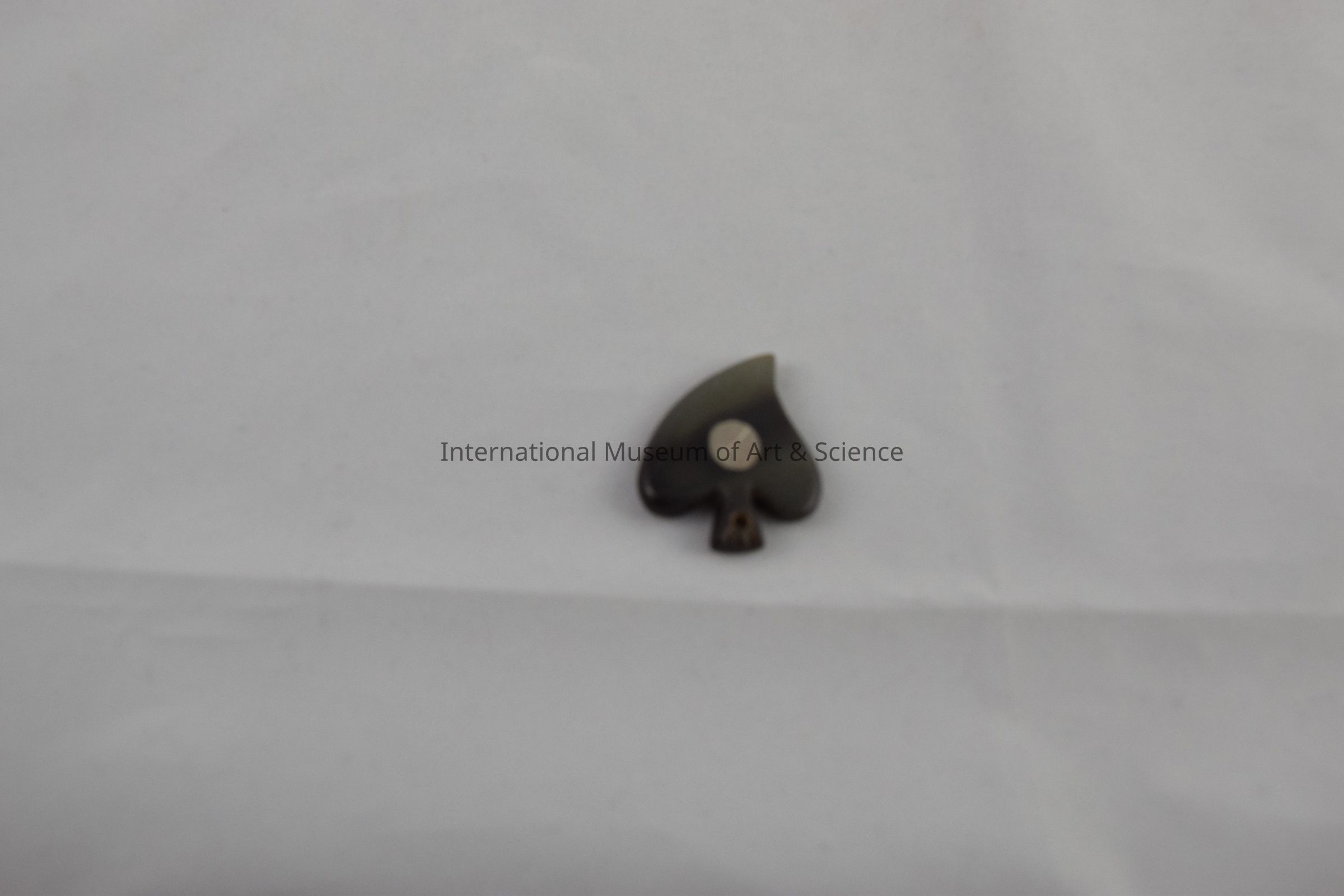 Heart pendant made from gray animal horn. There is a silver circle in center with an "x" plus a small hole for chain to be inserted.Dimensions