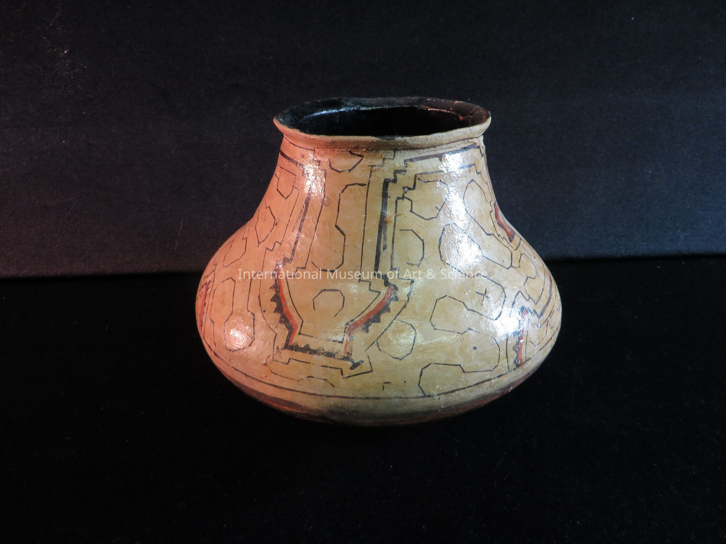 Ceramic bowl from Peru. The piece is handmade out of clay and then glazed with geometric designs in brown and reddish brown on beige background.Dimensions