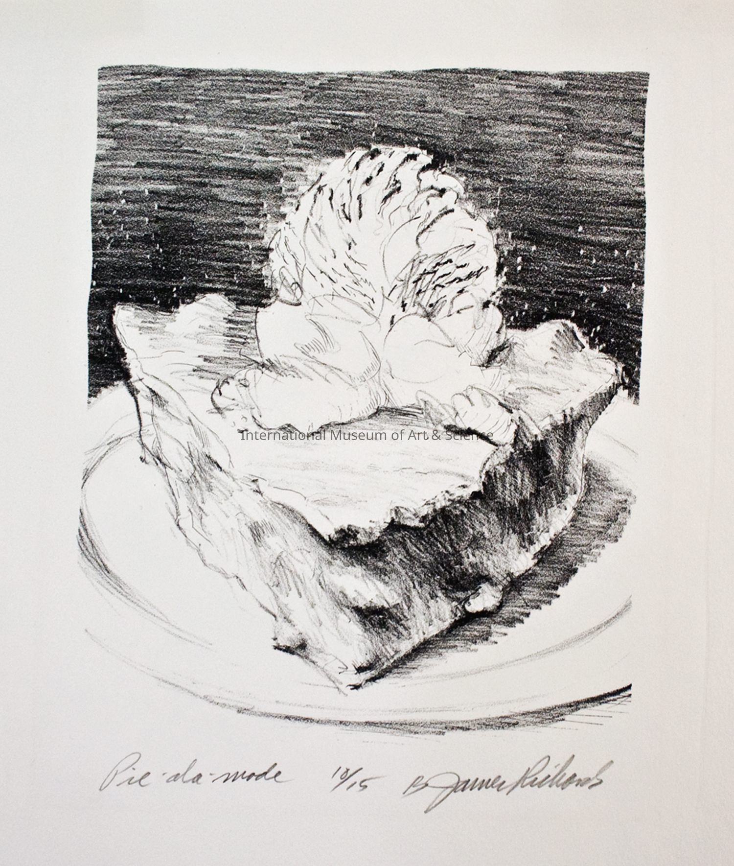 "Pie a la Mode". Small black and white print showing realistic drawing of a piece of pie on a plate with ice cream topping on the pie; solid gray graphite background behind plate above horizon line. Signed. 10/15Dimensions
