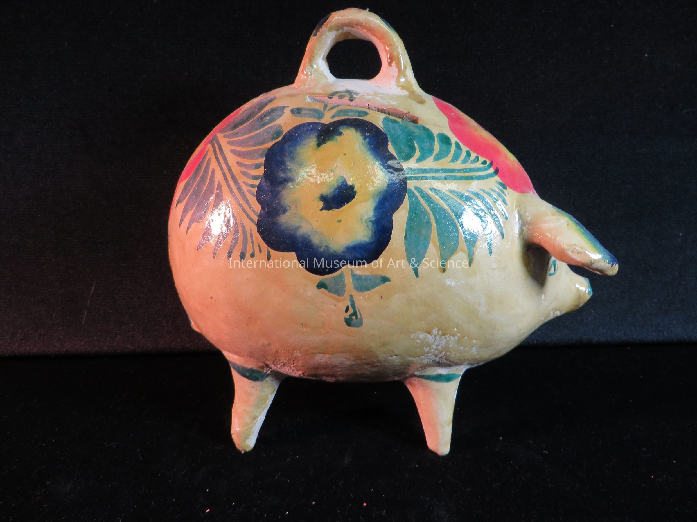 A clay bank in the shape of a pig. The pig has a curved handle at top, open money slit on one side. It has pointed ears, four short feet, small tail wide spherical body decorated with large multi-colored flowers of blue with yellow and red with yellow. The ears are striped with blue, green, and yellow.Artwork Details