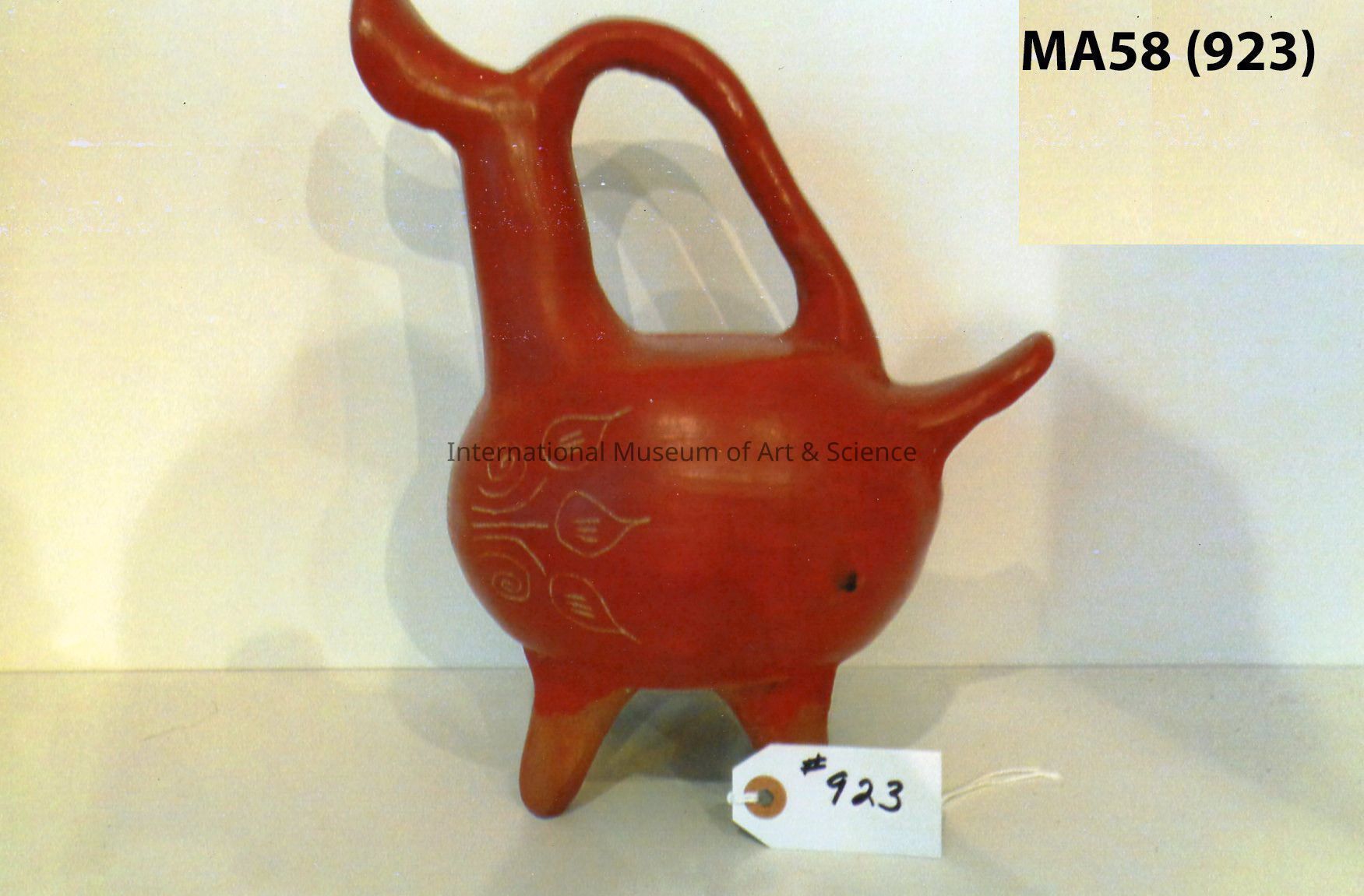 A ceramic pitcher. The pitcher is in the shape of a duck. The pitcher stands on four legs. The front of the pitcher has designs are etched into the side.Ethnography