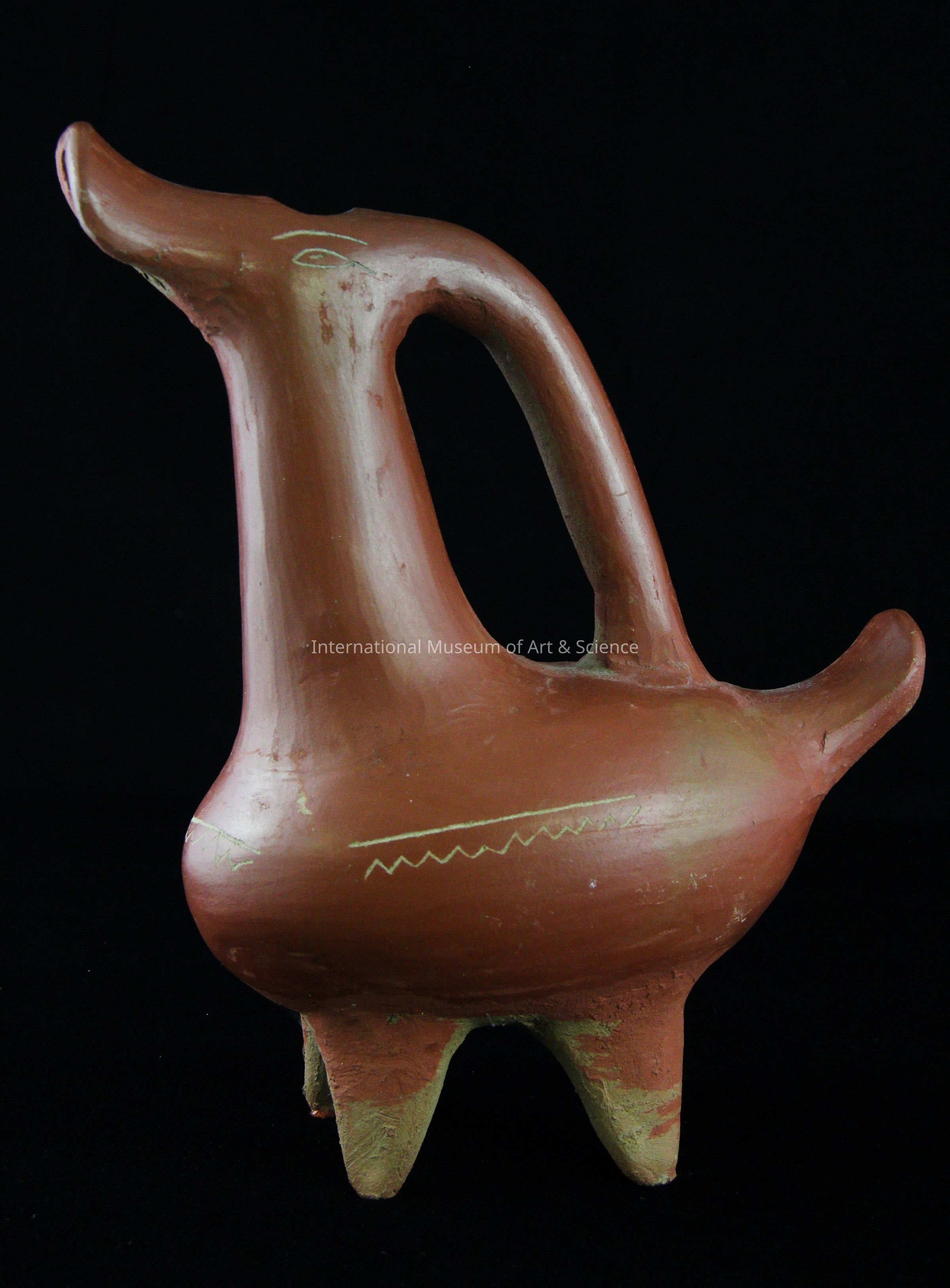 A ceramic clay water pitcher. The pitcher is in the shape of a duck. The pitcher has a long thin neck with a billed spout, an oval shaped body with a tail detail, and stands on for small legs. The pitcher is a burnt orange in color with tan detailing.Dimensions