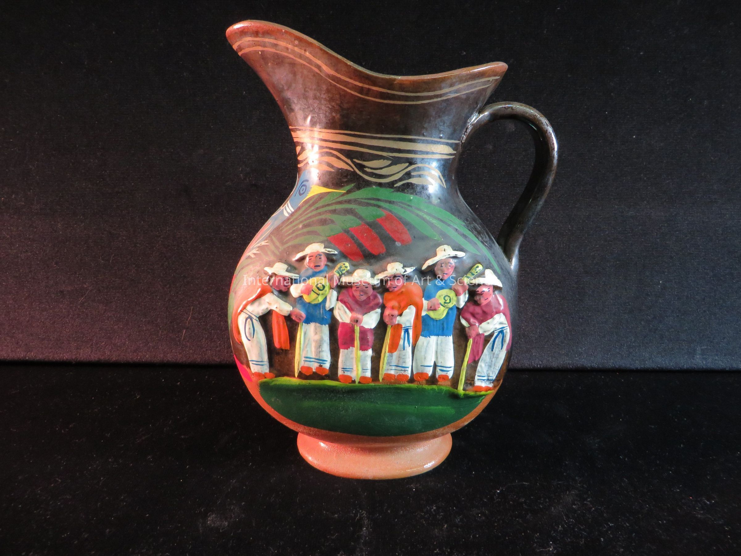 Glazed ceramic pitcher decorated on each side with relief depicting 6 men dressed in multi-colored serapes playing guitars.