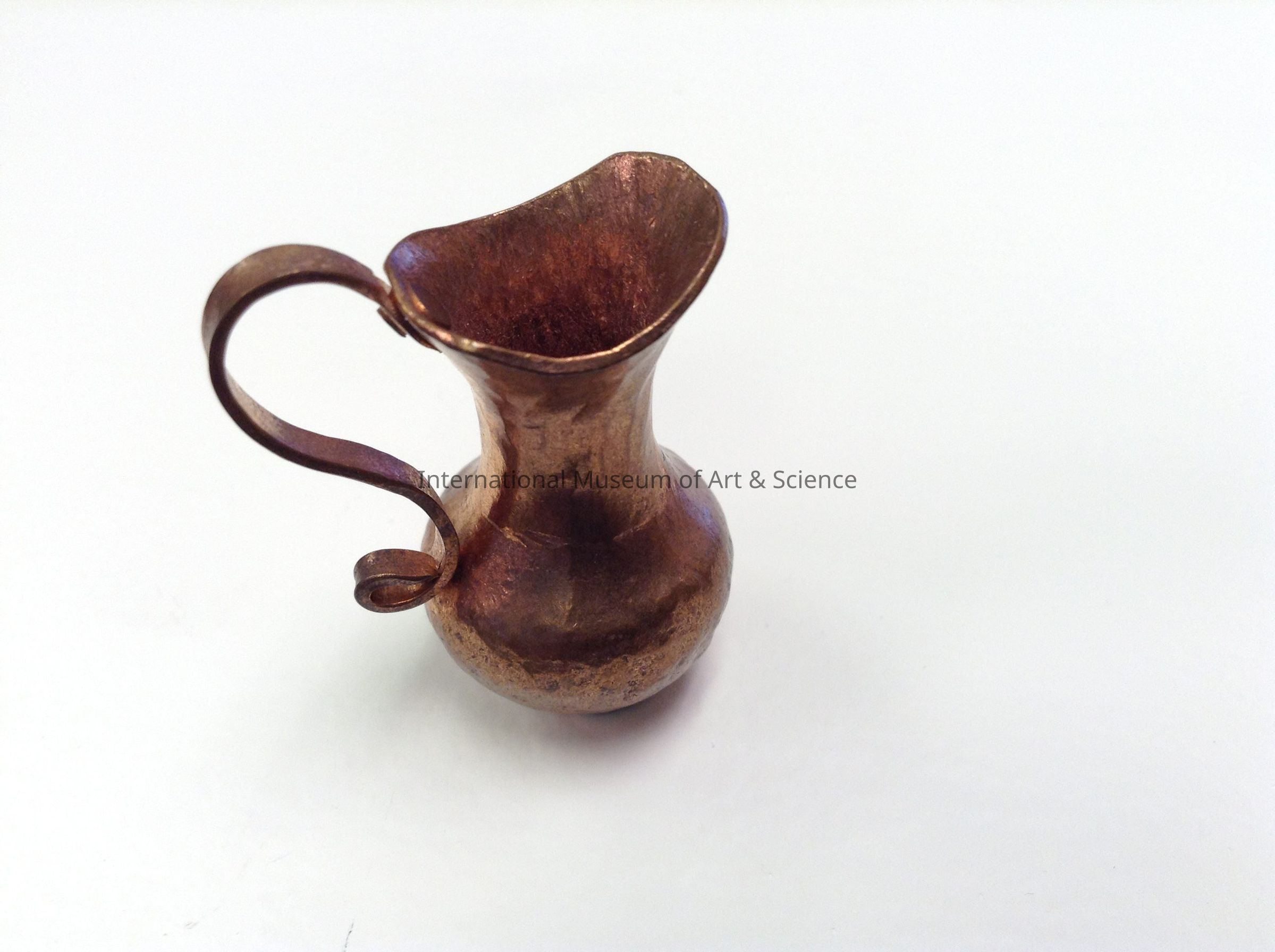 A miniature pitcher. The pitcher is hammered from copper. A flattened curved wire has been used for the handle.Dimensions