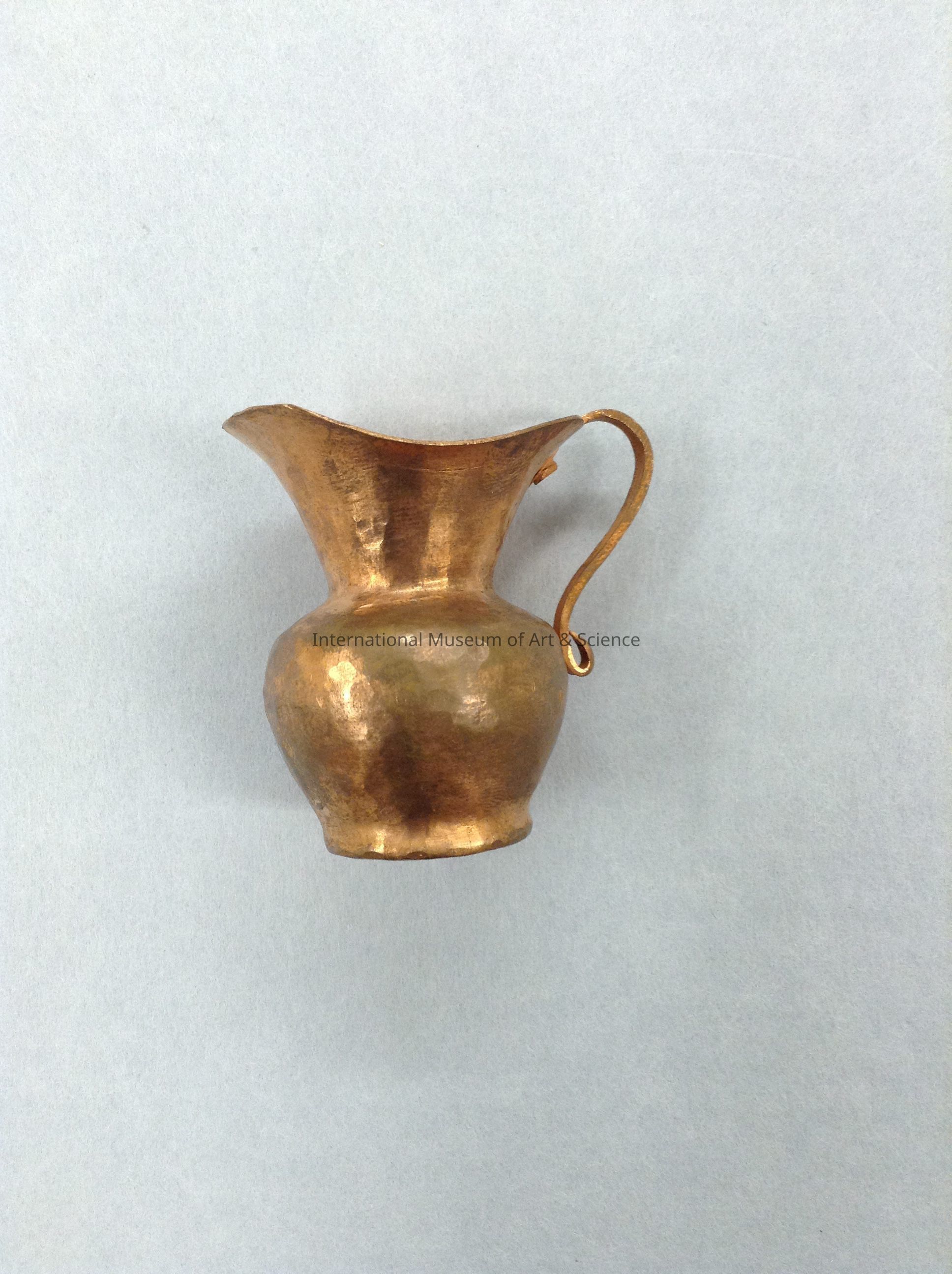 A miniature pitcher. It has a wide mouth and a curved handle. It is part of a 14 piece kitchenware set.Dimensions