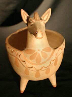 A small garden planter. The planter has zoomorphic features. There is a horse head with pointed ears and a mane. The body of the planter has four legs and a tail. The body of the plater is finished in an orange slip coating, but not the neck and head. There is an incised pattern along the rim of the vessel, with the incised areas painted with orange slip. The orange slip is also used to show details on the face and to create decorate on the body of the planter.Dimensions