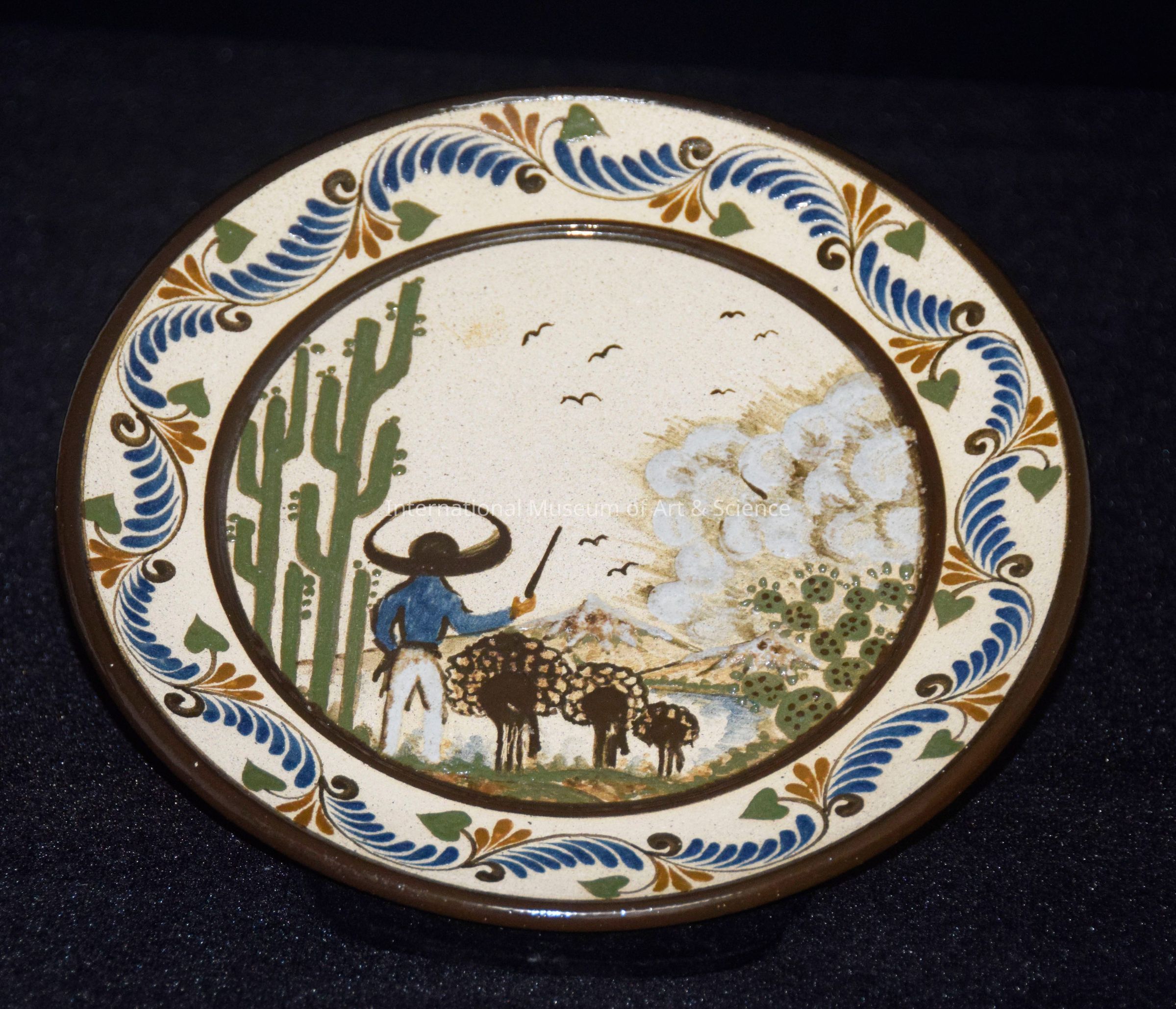 Bands of dark brown; dark brown border; green heart flowers with dark blue and brown leaves surround desert scenery; green cactus; man with blue shirt, white pants, wearing a sombrero and holding a rifle; brown birds in sky; mountains; three brown animals and white clouds.Artwork Details