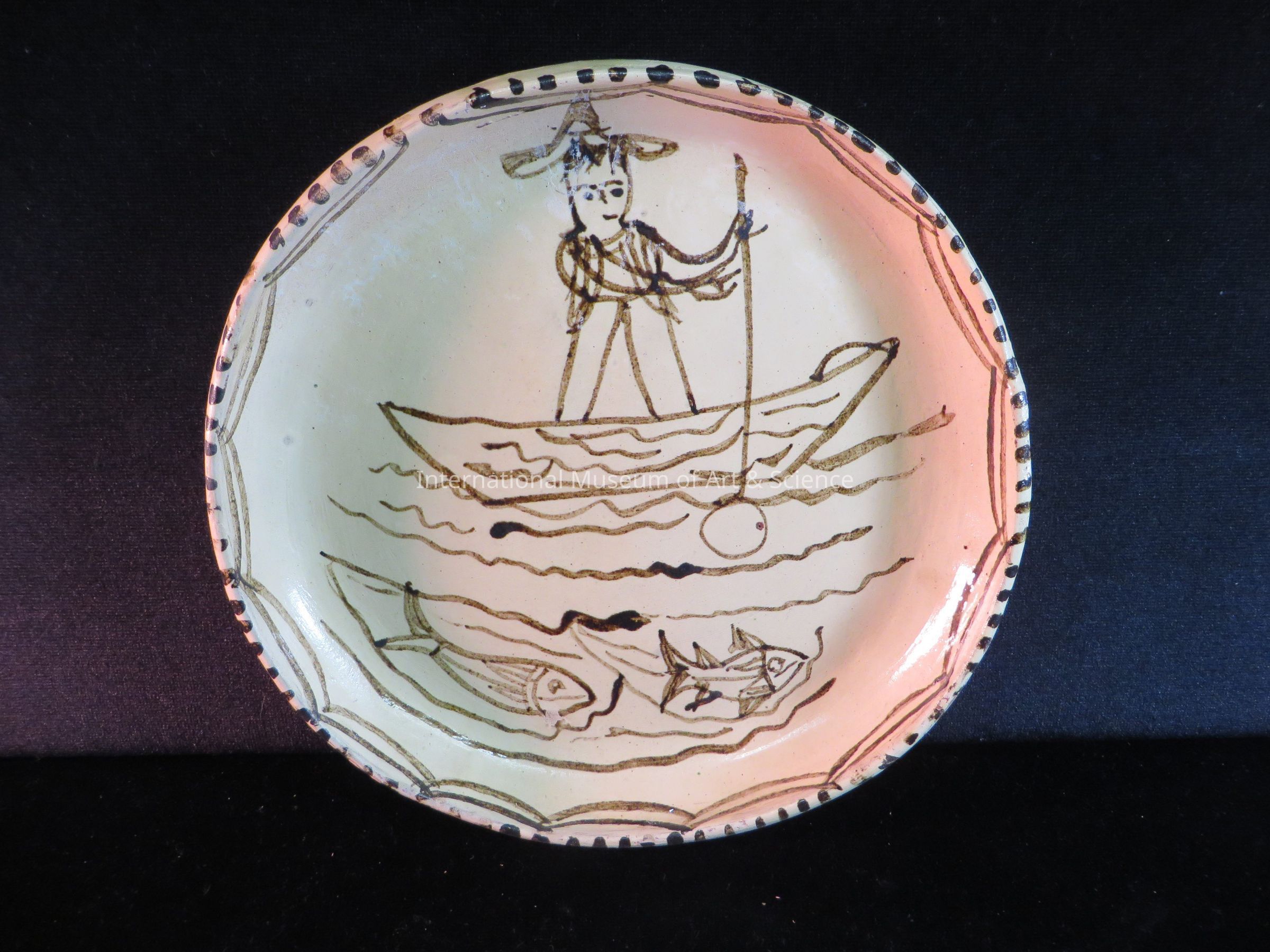 A ceramic plate in white. There are black lines decorating the edge and a central scene of a man in a boat fishing, with two fish swimming under the boat.Dimensions