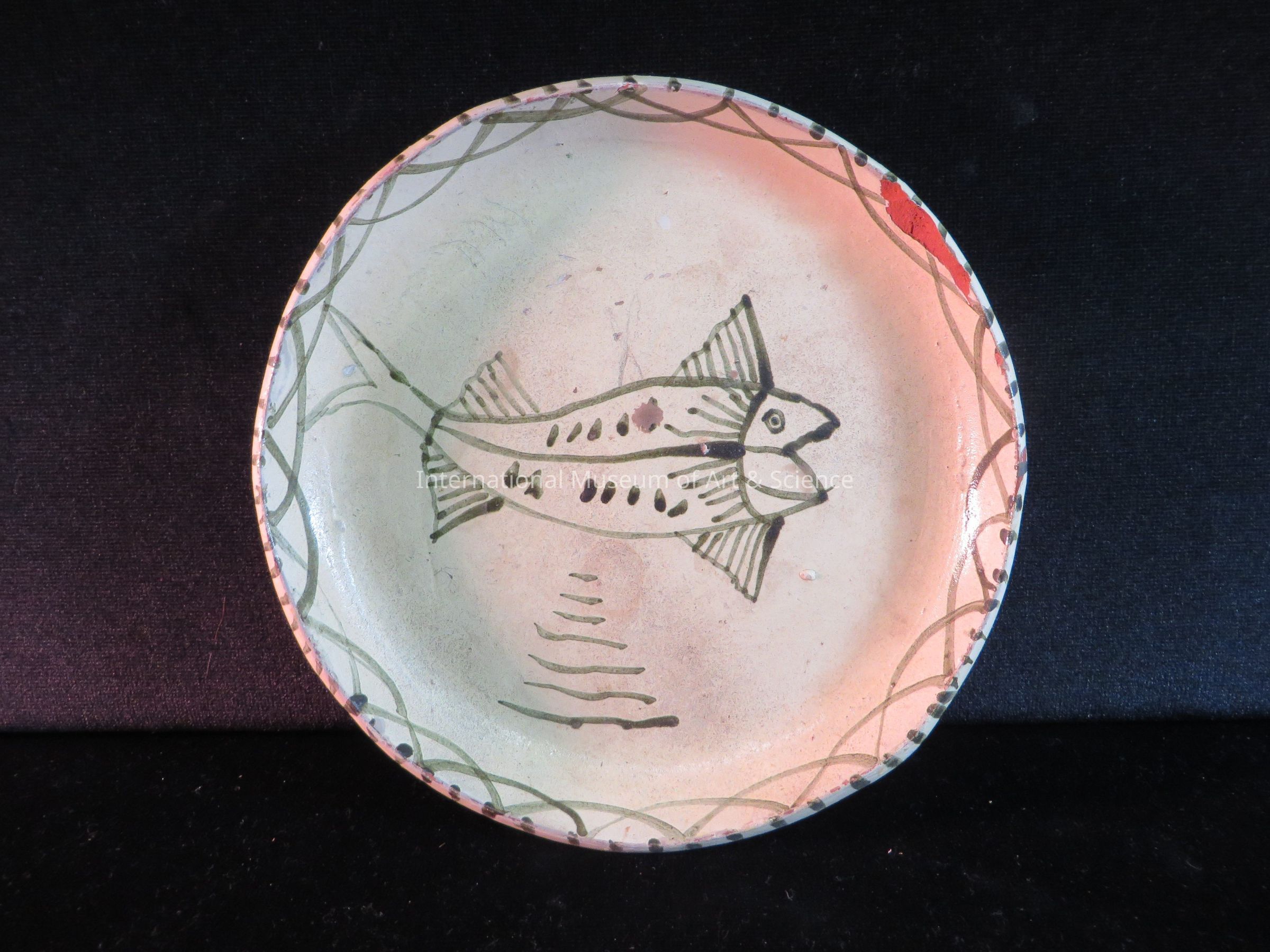 Shallow round plate of cream color; decorated with green stripes and crop groove designs on the top rim and a central design of a large fish with water marks. The number "3" is on the bottom.Artwork Details