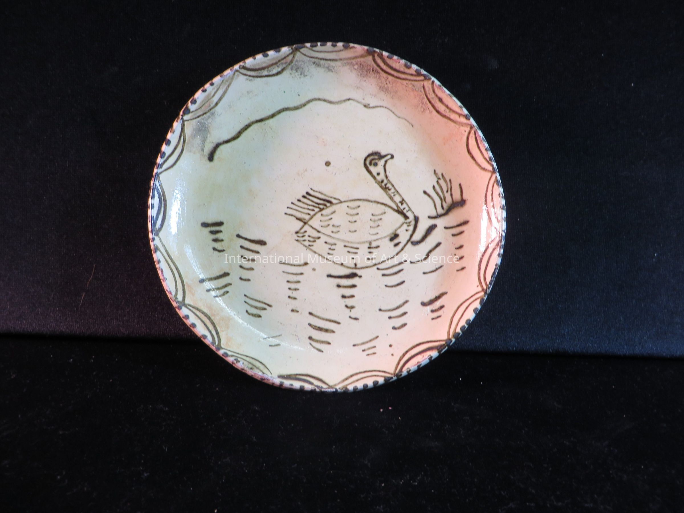 Round shallow clay plate in cream color decorated with line and scallop designs on the top rim and a central design of a duck on water.Ethnography