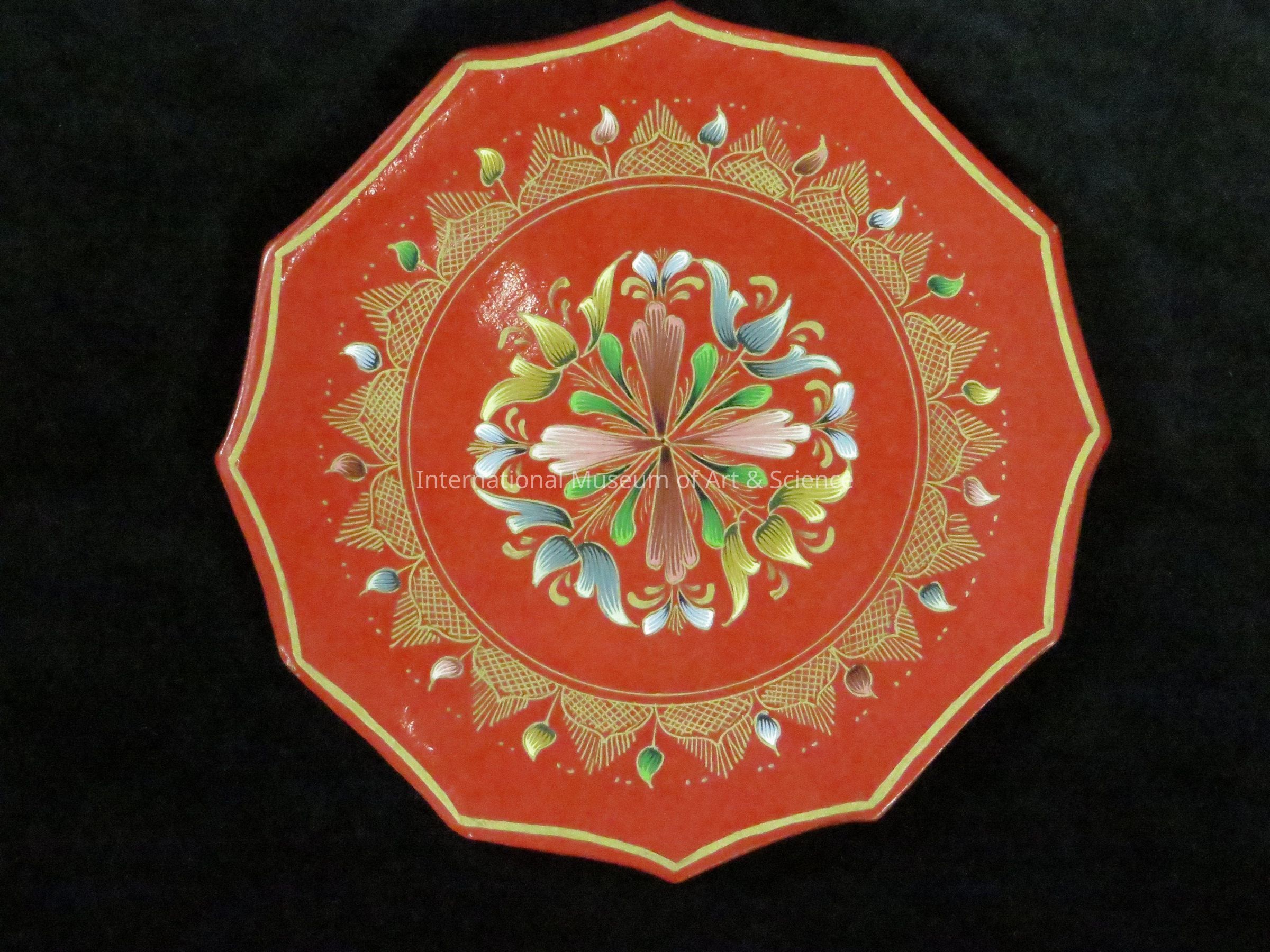 Plate. Patzcuaro, Michoacan. Mario Agustin Gaspar. Pino or madrona wood, lacquer, insect oils, bronze paint. 1986. Lacquered 12-sided plate; small; flat scalloped plate, red background, gold scalloped borders; large floral motifs with gold crown designs. Decorado fino process.
