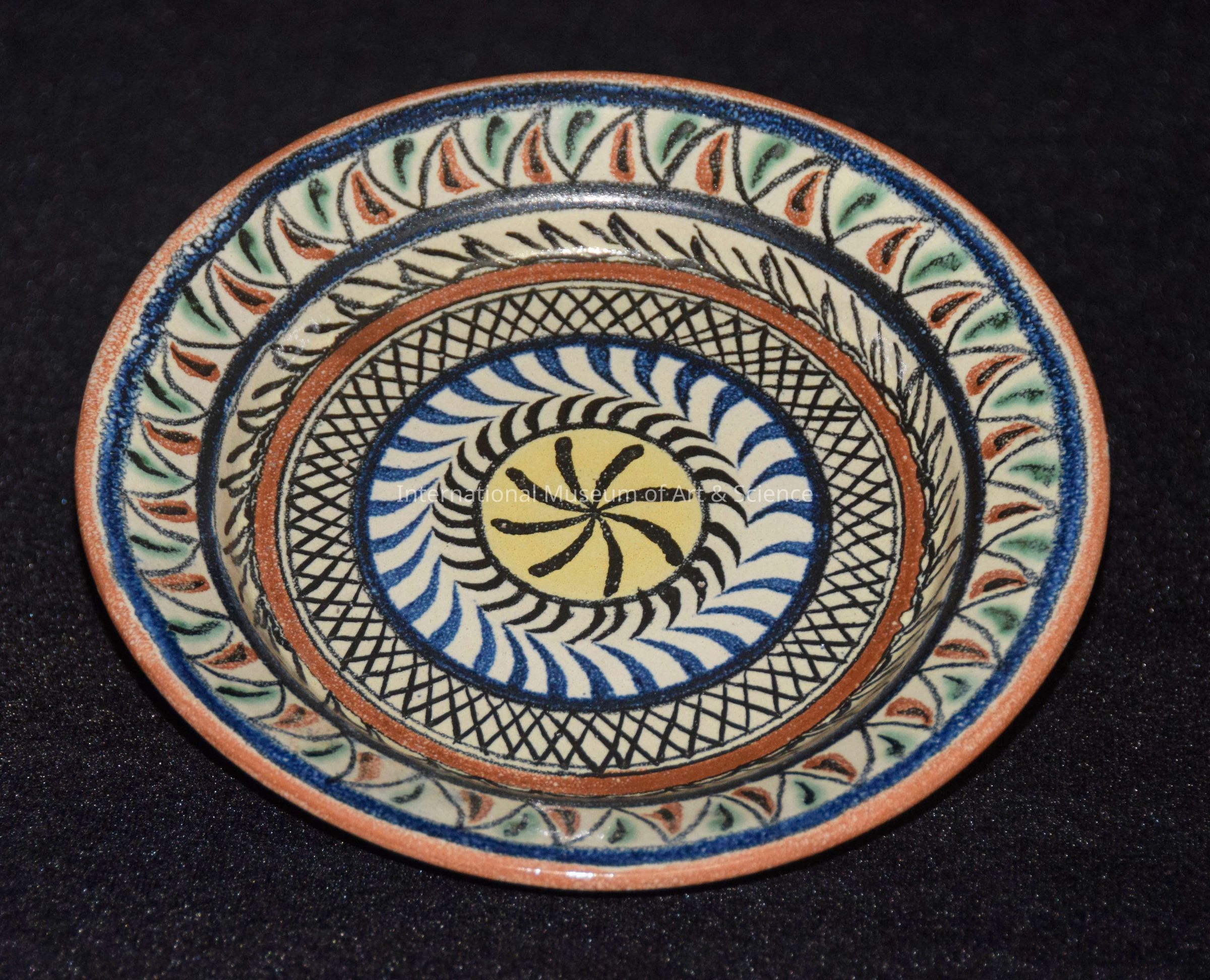 Cream background; brown and blue border; bands of light brown and dark blue; sun designs of yellow; band of black fishnet design; touches of brown and green leaves.Dimensions