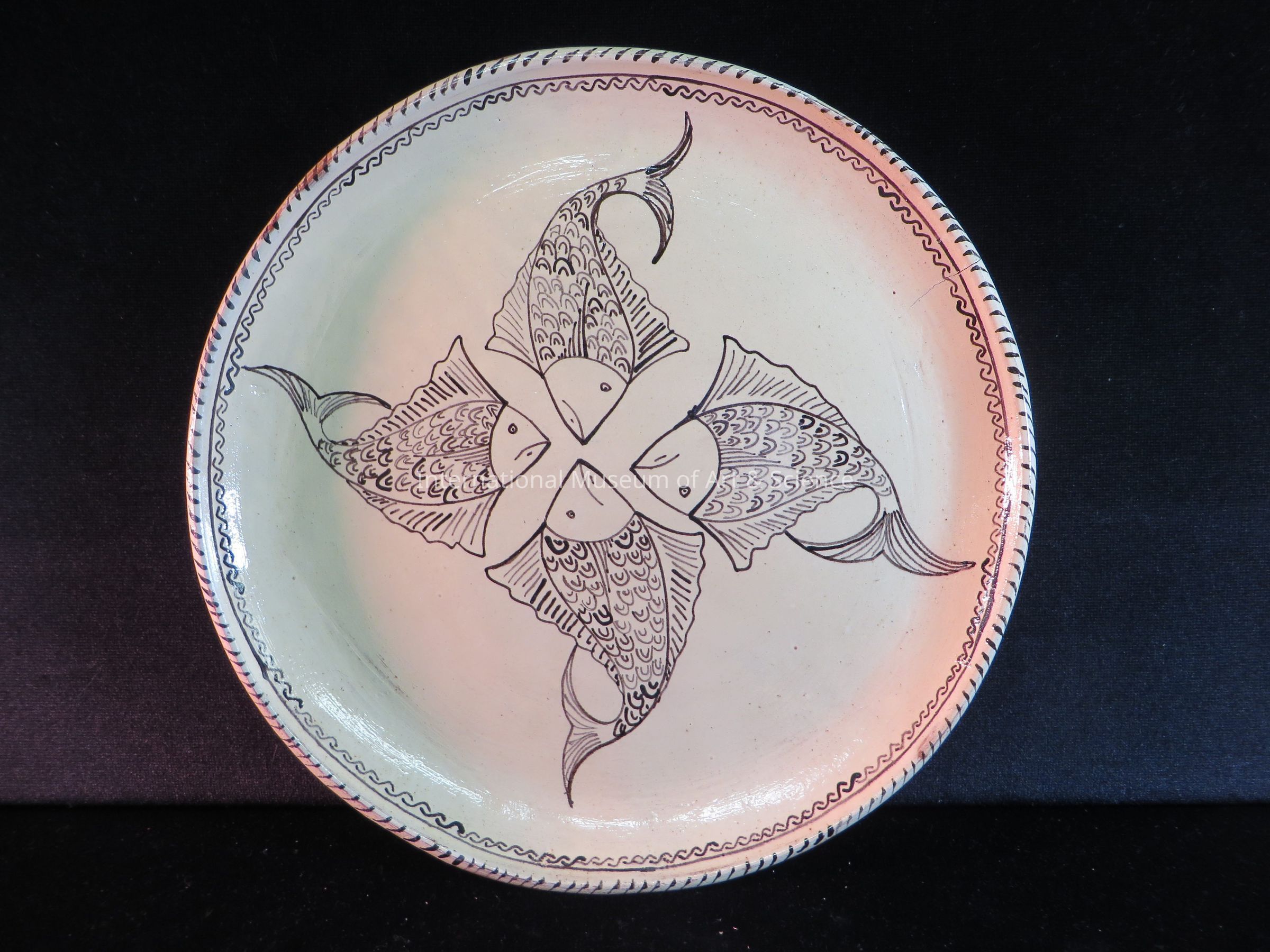 A ceramic plate in white with black line detailing at rim and a central image of four fish. The piece has an unfinished base and the letters "MM" written on the bottom.Dimensions