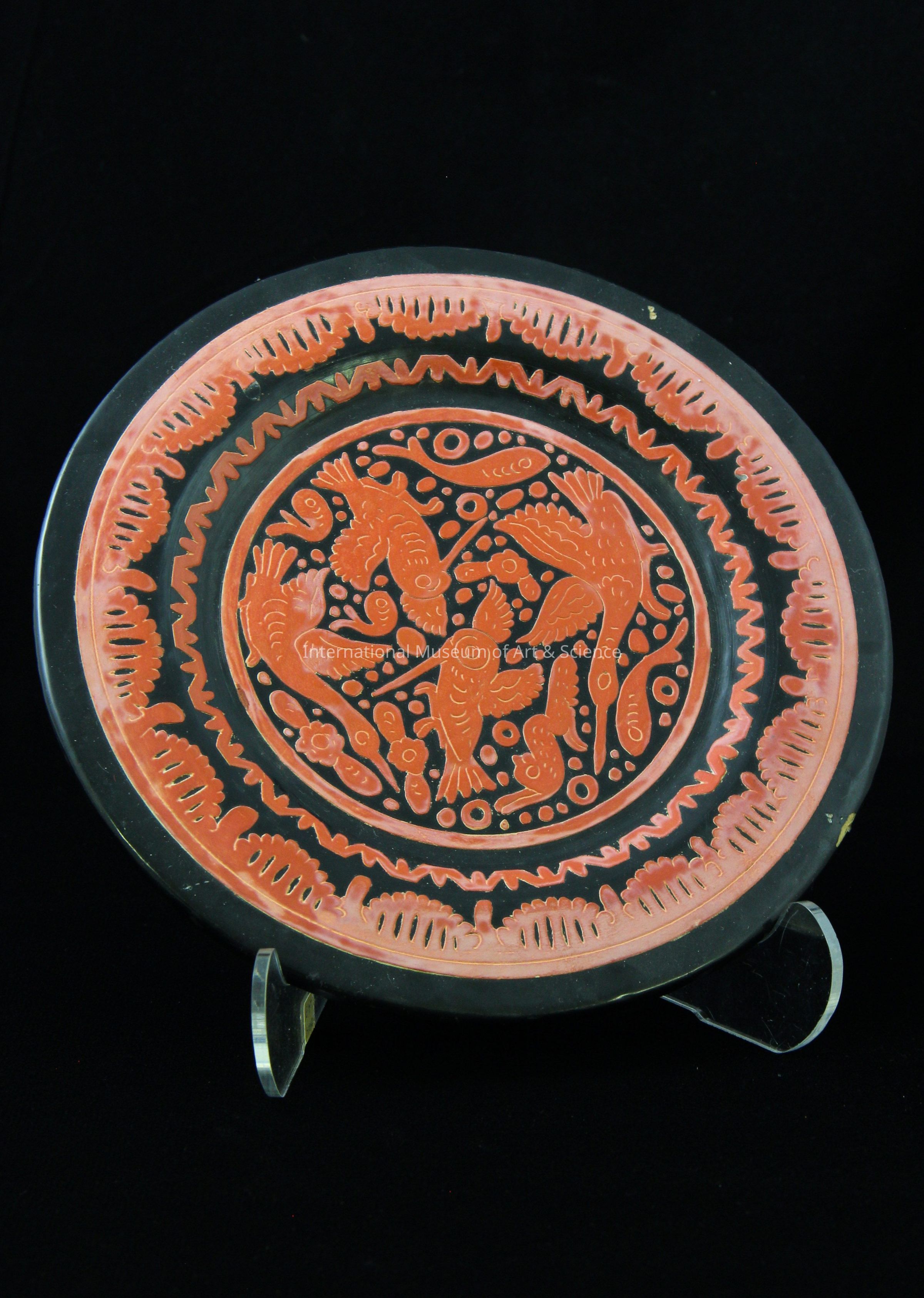 A wooden decorative plate. The base color of the plate is black with designs of birds, fish, and flowers plainted in an orange/red.Artwork Details