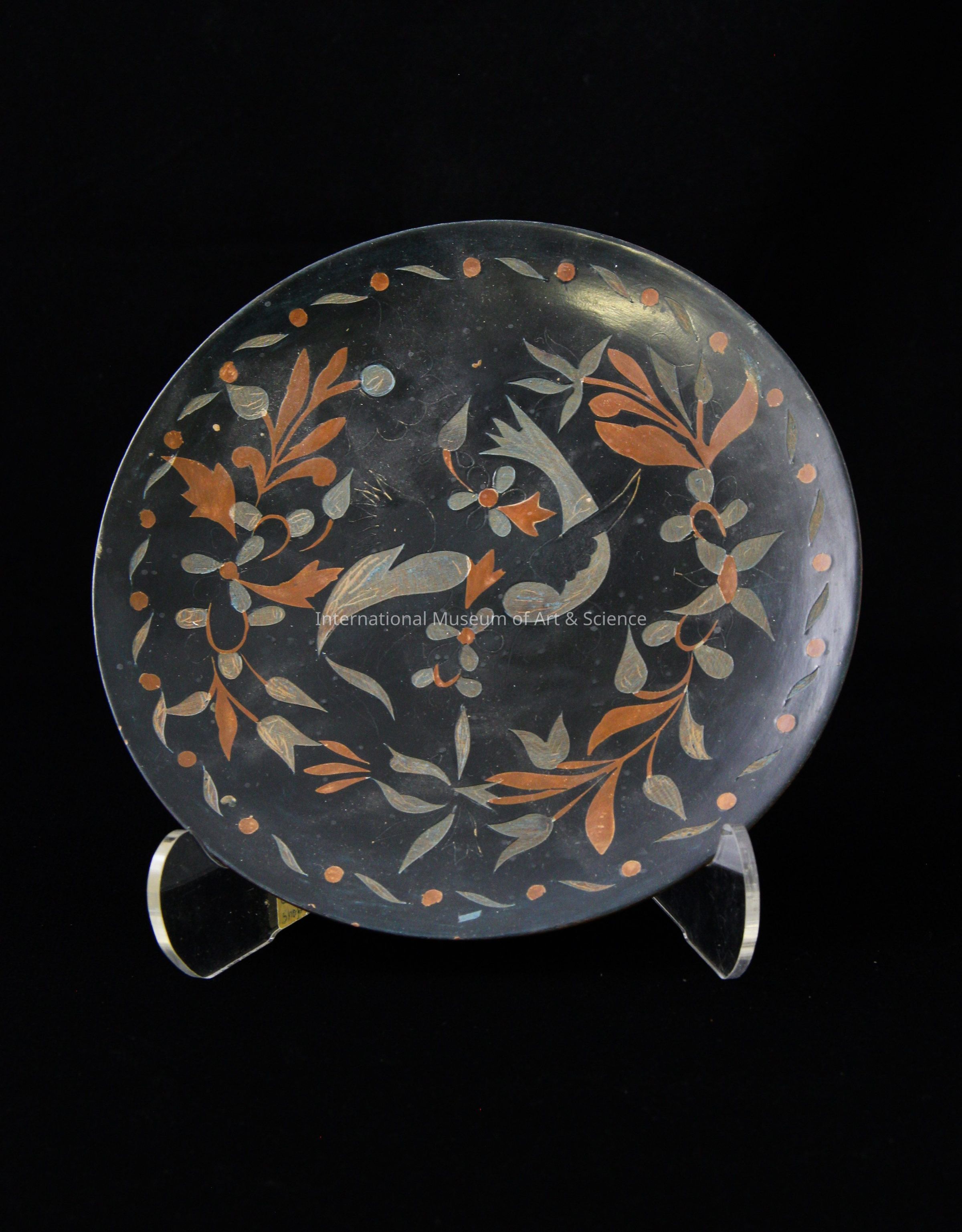 A wood plate. The underside of the plate is a dark brown and the top is painted black with designs carved into the surface. There are both aniaml and floral motifs carved into the surafce. The designs have also been painted with oranges and greys.Artwork Details