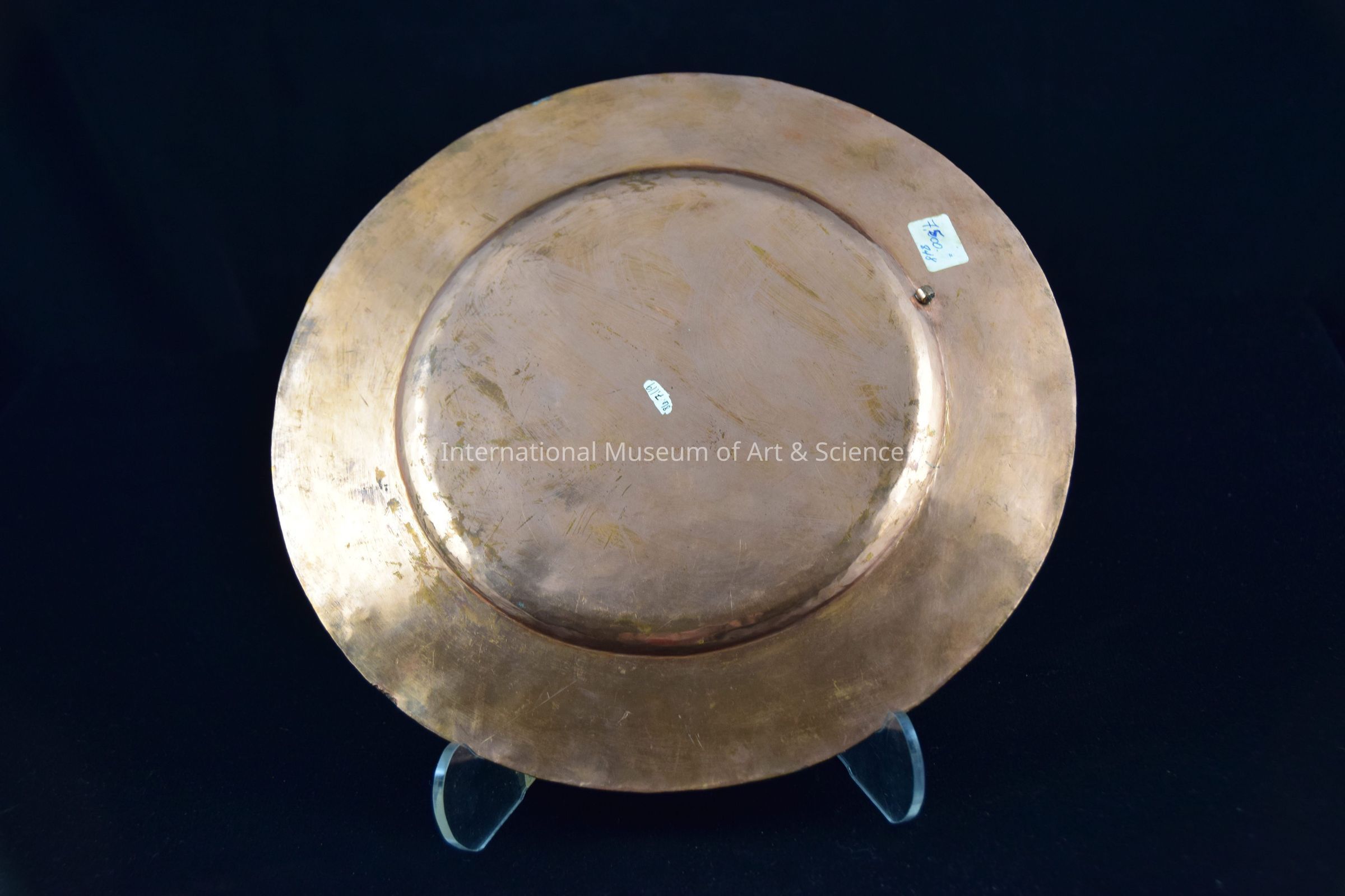 A silver-plated, copper plate. it is inlaid and etched with a floral design. The plate is covered with copper, then the copper has been etched away to form design of silver. The center has a copper flower with lines of detail on silver circle with border and silver triangle border design. The outside lip has diamond shape silver forms cut-out for design with borders.Dimensions