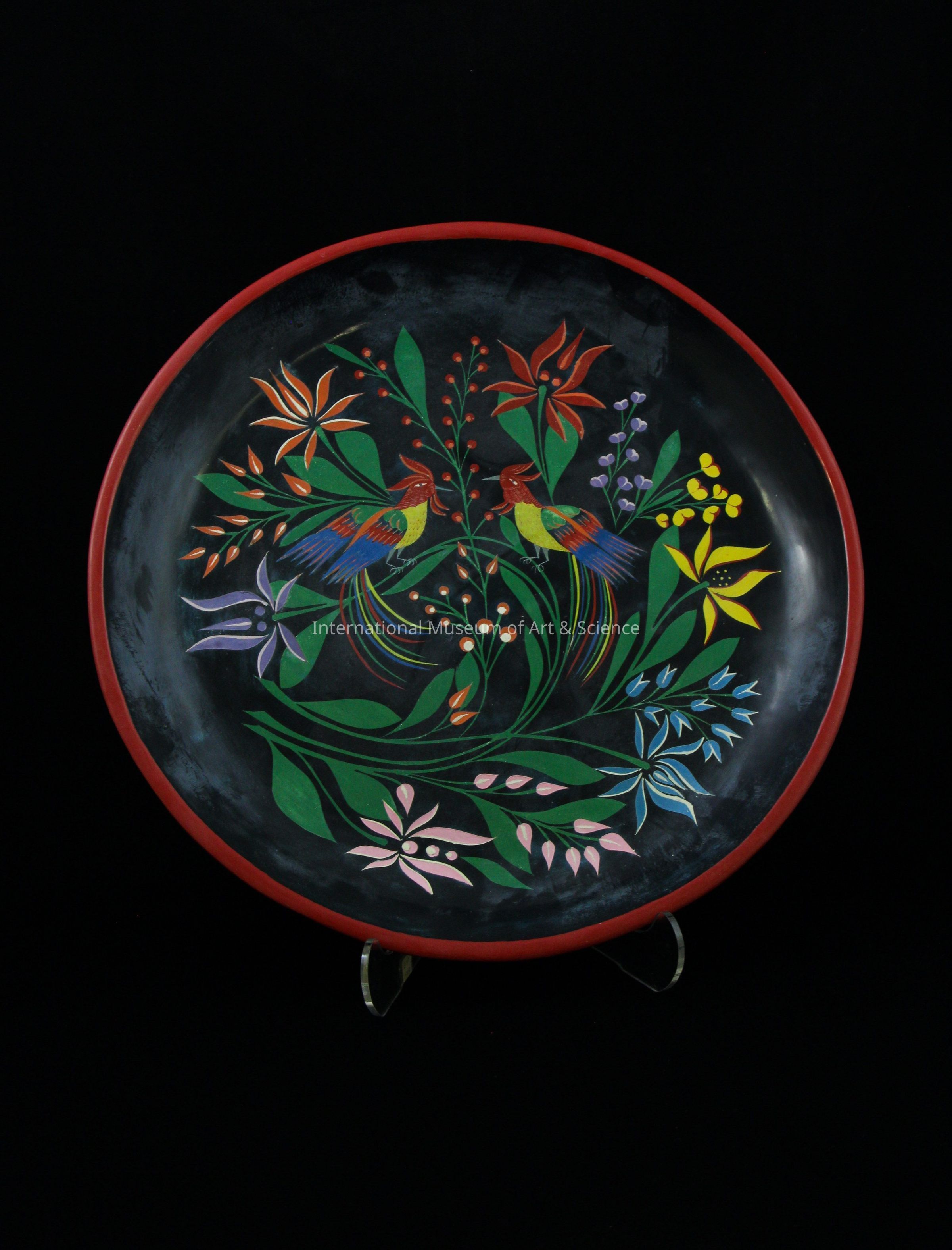 A wooden platter. The exterior of the platter is a dark brown. The interior of the platter is black with a red rim. In the center are painted two colorful birds with a floral motif around them.Artwork Details