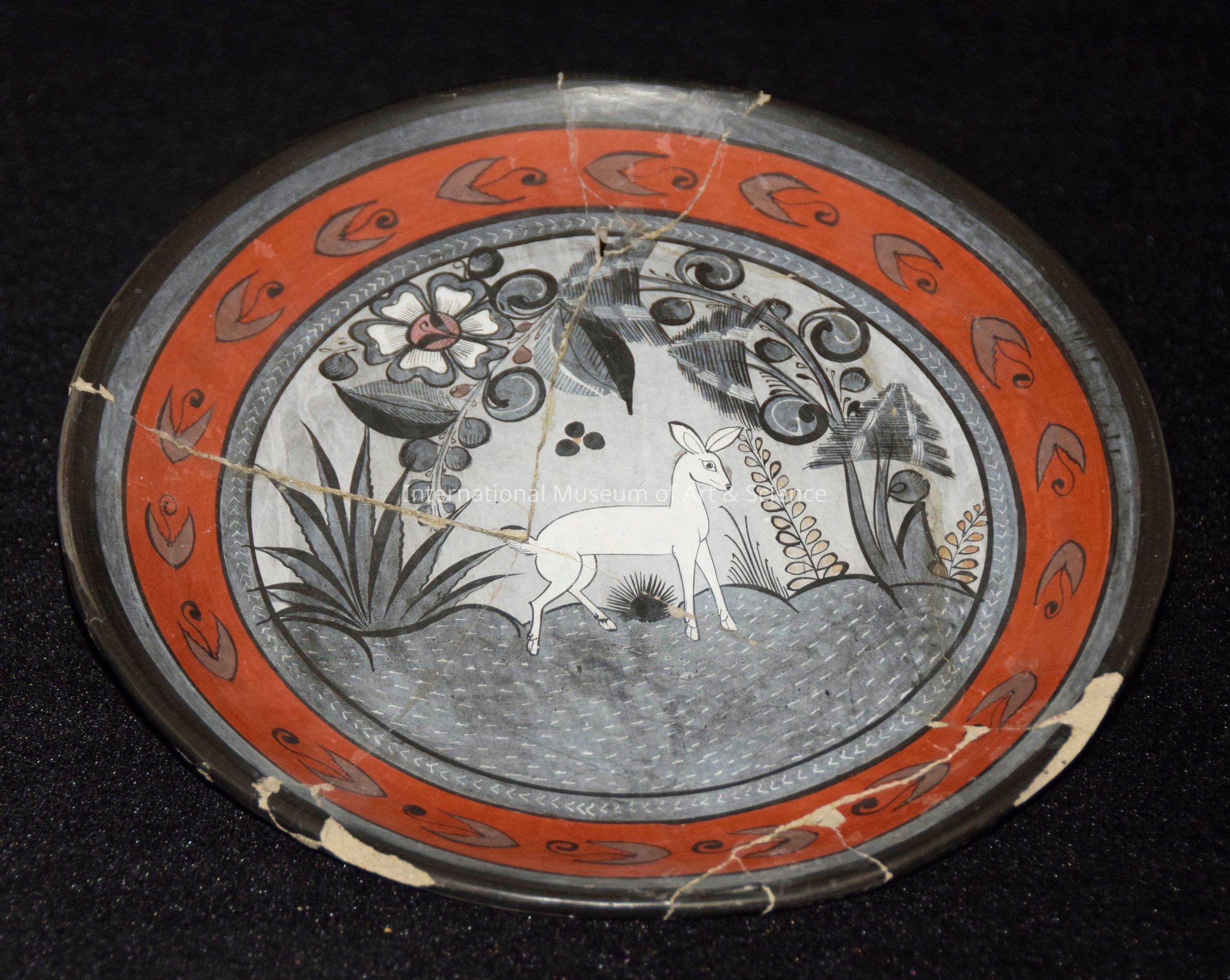 "Plate". Burnished clay plate with balck, gray, and red bands; central design depictsa white reindeer; gray plants, flowers, trees and hills.Dimensions