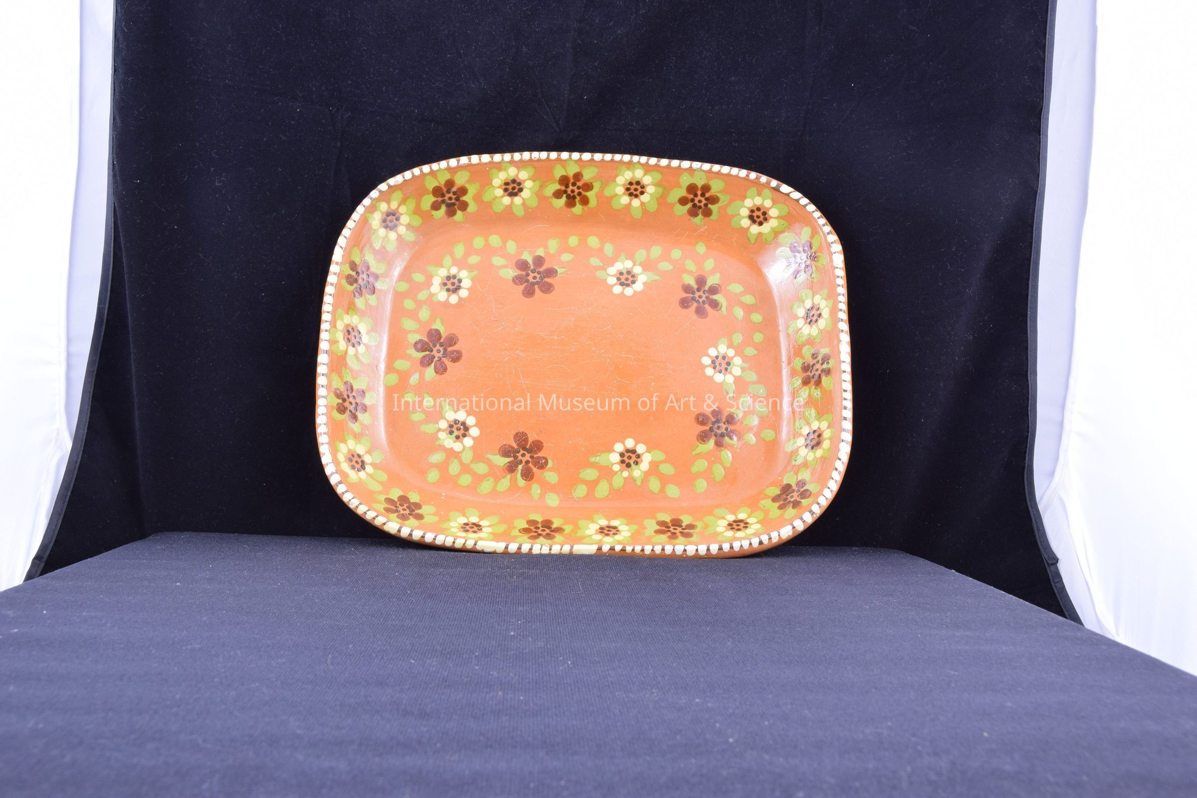 A large clay platter rectangular in shape flower designs on inside. The piece is glazed on the interior, but not the exterior.Dimensions