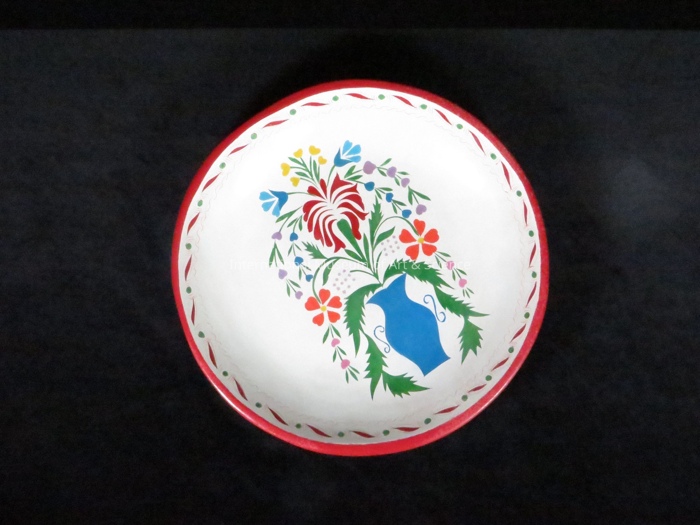Platter. Uruapan, Michoacan. Maria Salud Angel, Carmen Berber, Rosa Sanchez. Aile wood, lacquer, insect oils, powdered paints of earth, plant and animal. 1986. Maque platter, exterior dark brown, interior background is white, red trim, border of platter has green dots followed by red leaf motifs consecutively; blue vase with blue, red, orange flowers and green leaves with stems; medium size. For maque encrustado process.