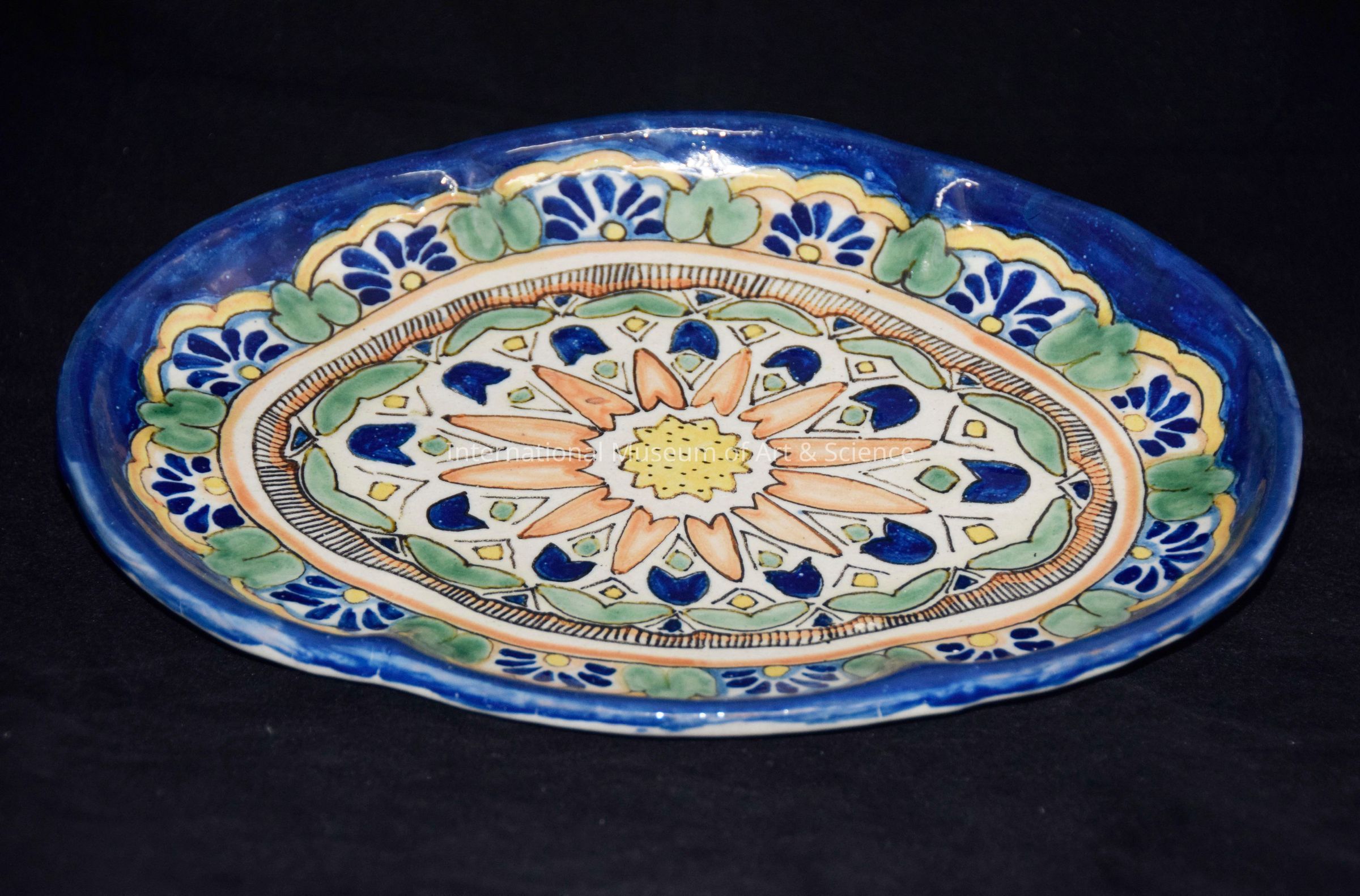 Platter. Blue edge multicolored pattern; geometrical design.