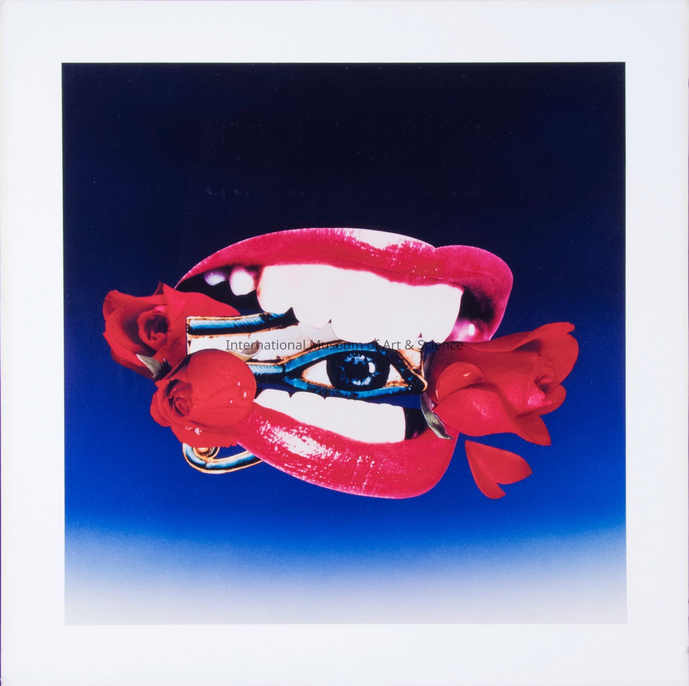 "Pleasure Devouring Wisdom". Mansfield, American. Photograoh. 1989 c. Egyptian eye in teeth, red lips, red roses, dark reds, blues, blue background; final, mounted on white paper and masonite.Artwork Details