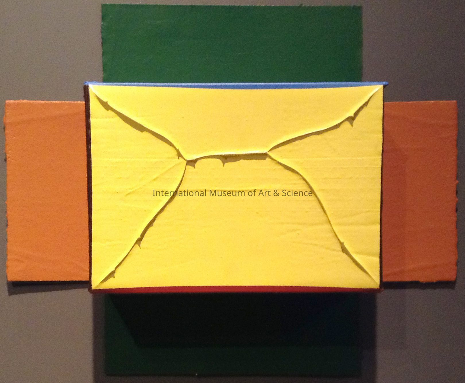 Relief sculpture of acrylic painted box, cardboard on foam core. Yellow, orange, black, and green.Artwork Details
