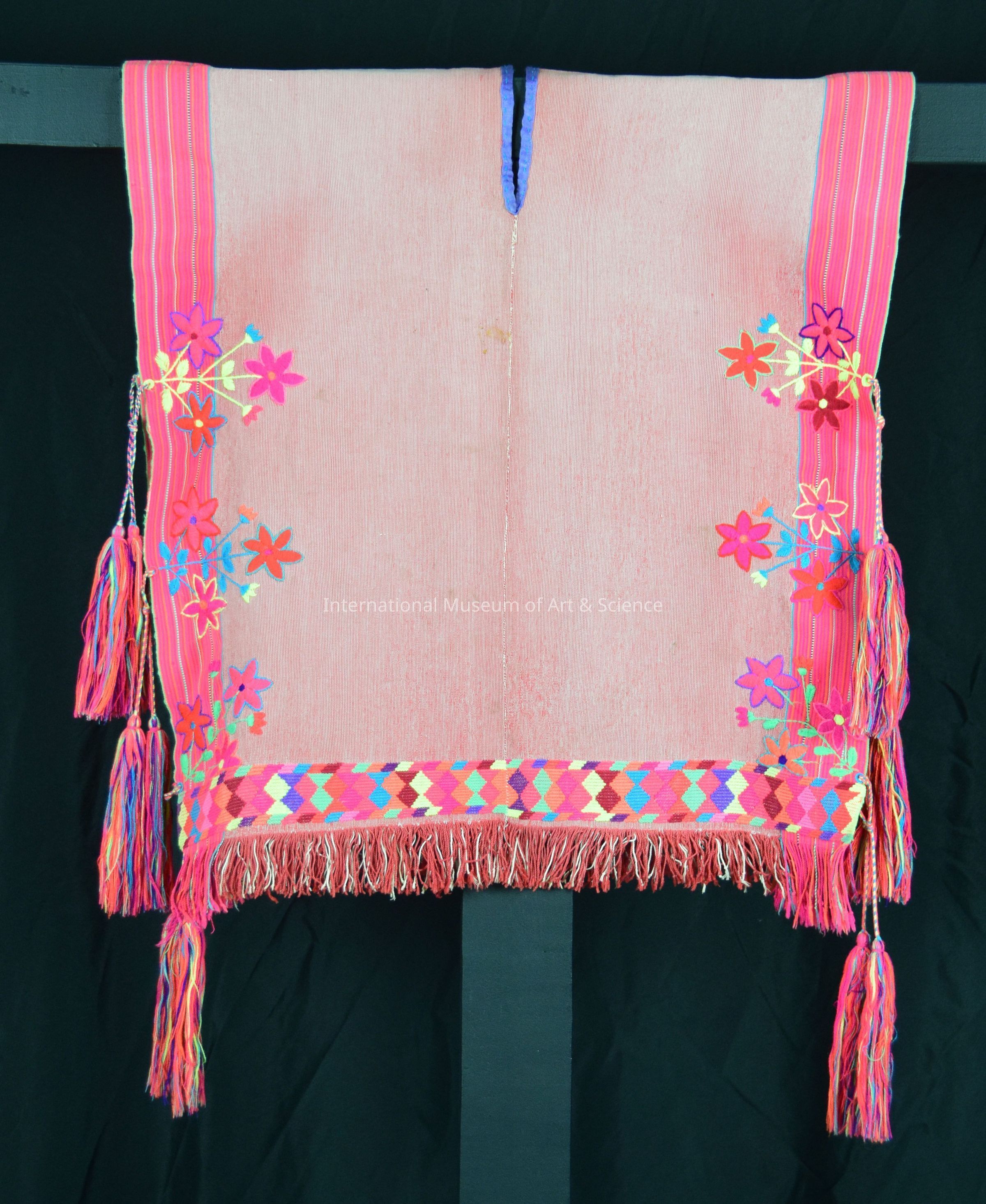 A man's tunic (chamarro). Purple v-neck; bright pink borders with large multicolored flowers and tassels tied on open sides; flourescent colors. Culture: Tzotzil. Stain on frontArtwork Details