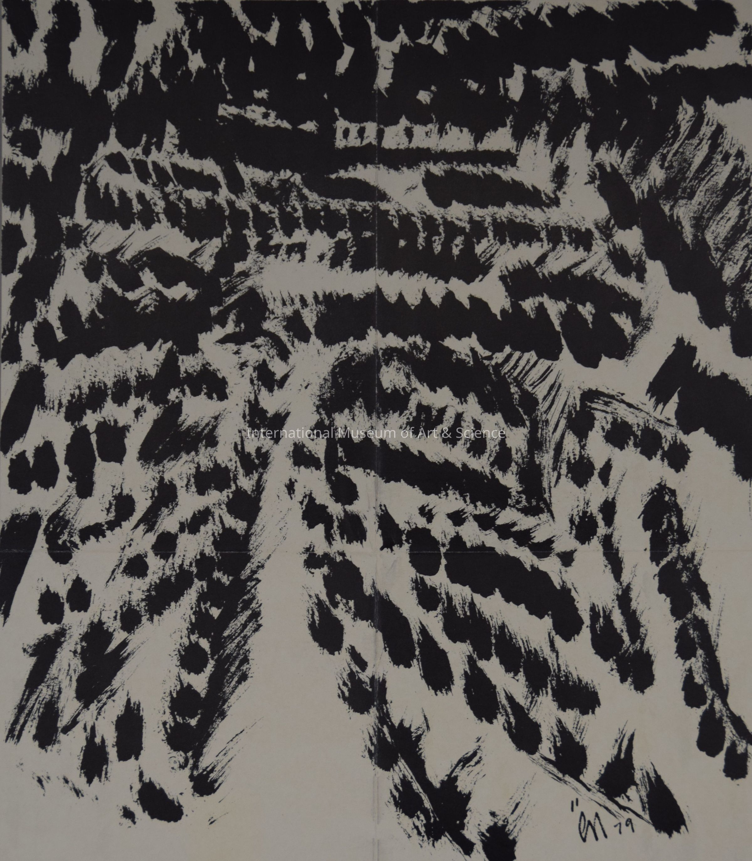 "Grovescape" ; original poster by E.E. Nichols. Shows dabs of black on a white background. Gray border with the title "Grovescape" in white letters. This is the original of the poster that Nichols painted on in 1979.29.001.001Dimensions