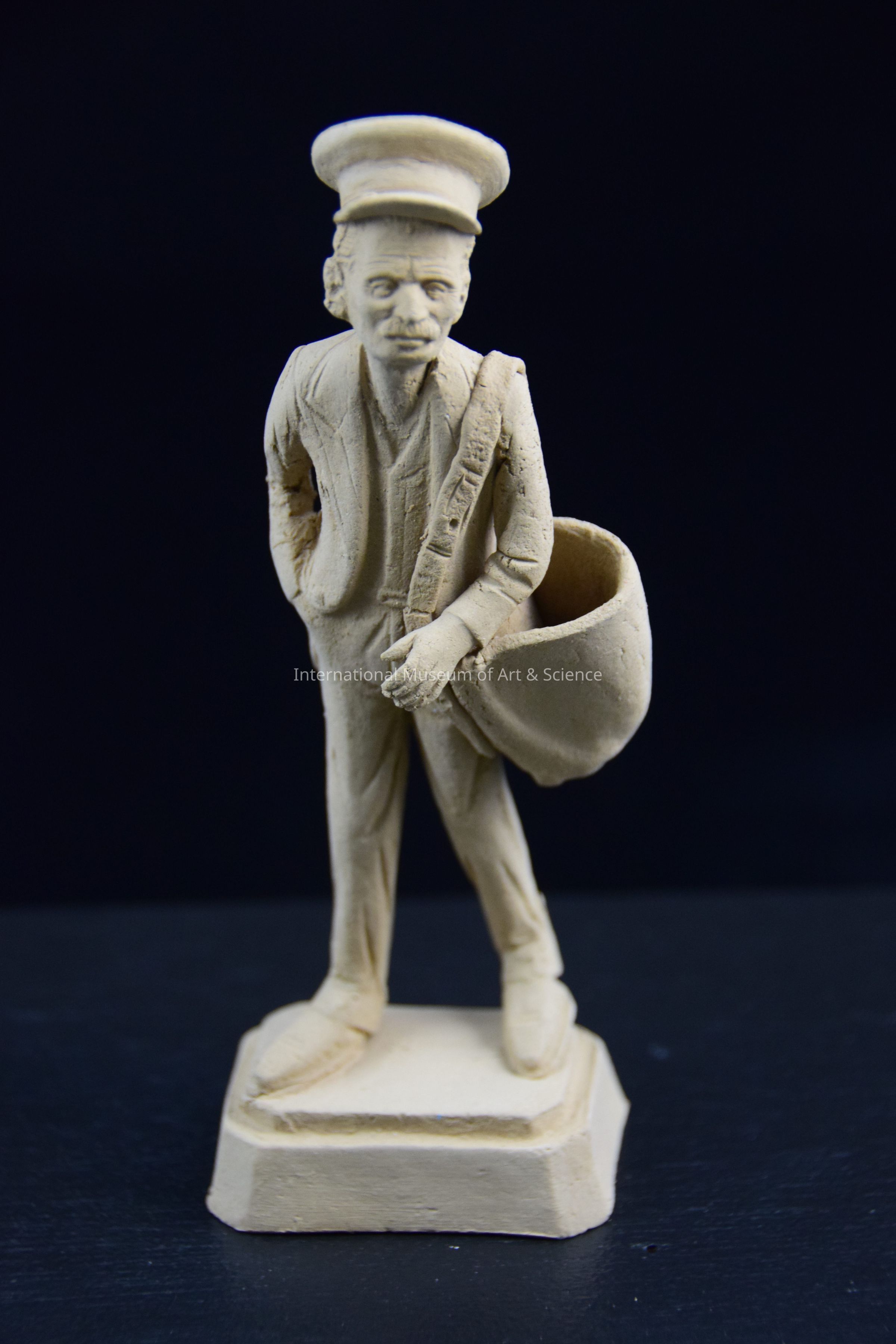 A standing figure on square base, that is unpainted and a natural clay color of tan. Postman is wearing a cap, suitpants, shoes, and a hat. He is carrying an empty mailbag. the figure has fine facial features.Made/Created